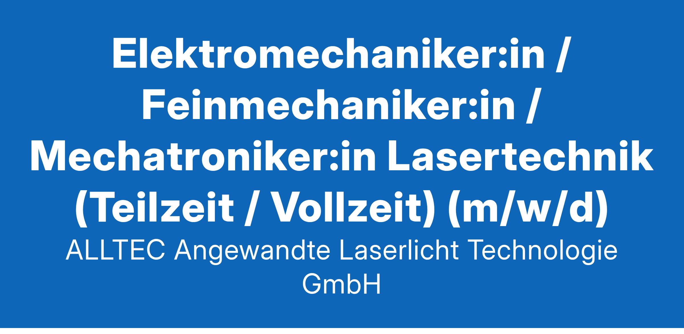 Das unverzichtbare Logo auf dem Smartphone, der QR-Code, der ein Automobilbauteil eindeutig rückverfolgbar macht, das Haltbarkeitsdatum auf der Getränkedose: Fast alle industriell gefertigten Produkte müssen gekennzeichnet werden. Mit den Marken FOBA, Linx und Videojet gehört Alltec zu den innovativsten Unternehmen im Bereich der Produktkennzeichnung mit Lasern. Als einer der Markt- und Technologieführer entwickeln wir richtungsweisende Lösungen für die zuverlässige Laserbeschriftung und haben dabei die Trends der Zukunft stets im Blick. Je nach Anforderung integrieren wir bei unseren Kunden die passende Lasertechnologie und ergänzende Optionen, wie zum Beispiel Vision-Systeme oder maßgeschneiderte Schnittstellen. Unser Fokus ist, immer die optimale System- und Maschinenlösung für die jeweilige Kennzeichnungsaufgabe zu liefern. Mit Standorten auf der ganzen Welt sind wir da, wo unsere internationalen Kunden uns brauchen. Als Teil der Veralto-Unternehmensfamilie profitieren wir von einem globalen Wissenschafts- und Technologienetzwerk. Wir suchen zum nächstmöglichen Zeitpunkt an unserem Standort Selmsdorf bei Lübeck eine:n Elektromechaniker:in / Feinmechaniker:in / Mechatroniker:in Lasertechnik in Teil- oder Vollzeit Ihre Hauptaufgaben Montage von Komponenten und Lasermarkiersystemen, inklusive Dokumentation Elektrische, mechanische und optische Fehleranalyse sowie Beheben von Komponenten- und Montagefehlern Durchführen kundenspezifischer Tests und Systemanalysen zur Sicherstellung unserer hohen Qualitätsanforderungen, inklusive Ergebnisdokumentation Mitarbeit bei der Einführung neuer Produkte in Zusammenarbeit mit der Entwicklung und Projektabwicklung Aktive Teilnahme an Kaizen (Kontinuierlicher Verbesserungsprozess / KVP) Ihr Profil Berufsausbildung und Erfahrung als Mechatroniker:in, Feinmechaniker:in oder Elektromechaniker:in Auch Quereinsteiger:innen mit mehrjähriger Berufserfahrung sind herzlich willkommen Sie besitzen eine gewisse Affinität und Geduld, umfangreiche Justagen und Fehleranalysen durchzuführen Das bieten wir 30 Tage Urlaub, Mitarbeiterbonus, Jubiläumszahlungen sowie jährliche Gehaltsüberprüfung Betriebliche Altersvorsorge (Entgeltumwandlung), Unfallversicherung und Gesundheitsvorsorge E-Bike-Leasing nach der Probezeit Gezielte Personalentwicklungs- und Weiterbildungsmaßnahmen Attraktives Mitarbeiterempfehlungsprogramm, Kurzpraktika und Mitarbeiterevents Im Rahmen eines internationalen Konzerns erwarten Sie interessante berufliche Perspektiven. Wir bieten abwechslungsreiche Aufgabenstellungen, die sich stets an der neuesten Technologie orientieren. Ein leistungsorientiertes Entgelt versteht sich dabei von selbst. Ihre Chance Ergreifen Sie jetzt Ihre Chance und bewerben Sie sich über unser Karriereportal! Wir weisen ausdrücklich darauf hin, dass wir uns auch über Bewerbungen von Menschen mit Behinderung freuen. ALLTEC Angewandte Laserlicht Technologie GmbH An der Trave 27–31 23923 Selmsdorf T (Inhalt entfernt) 55–0 F (Inhalt entfernt) 55–222 (Inhalt entfernt) (Inhalt entfernt)