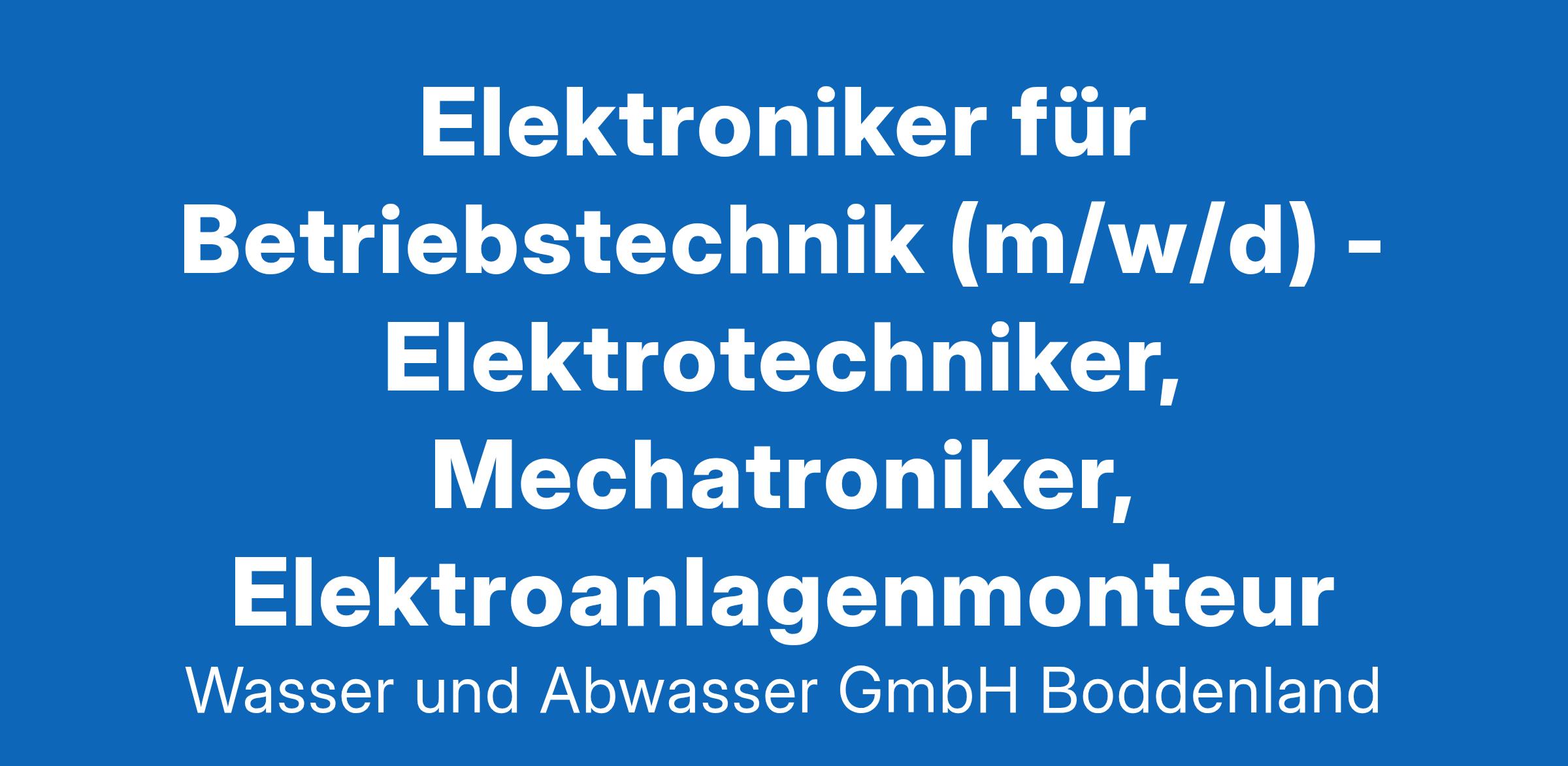 Unser Hauptaufgabengebiet ist es die Bevölkerung, Unternehmen und Sonstige mit Trink- und Brauchwasser zu versorgen sowie Dienstleistungen aller Art durchzuführen, insbesondere die Betreibung von kommunalen Einrichtungen zur Abwasseraufbereitung. Die technische und kaufmännische Betriebsführung umfasst 3 Zweckverbände und Eigenbetriebe.Derzeit beschäftigt die WA GmbH -Boddenland- 80 Mitarbeiter und Mitarbeiterinnen, davon aktuell 9 Auszubildende.Ab sofort suchen wir einen Elektroniker, Elektrotechniker, Mechatroniker, Elektroanlagenmonteur oder vergleichbar alsElektroniker für Betriebstechnik (m/w/d)Ihr Aufgabengebiet als Elektroniker für Betriebstechnik (m/w/d):Elektroarbeiten im Trink- und AbwasserbereichWartungs- und InstandhaltungsarbeitenStörungssuche und BeseitigungInbetriebnahme und Parametrierung von GerätenERP und Archivierungssysteme - Datenlage und FehlerbeseitigungPVI ortsveränderlicher Elektrogerätezyklische Überprüfung von RauchmeldernWir erwarten:Elektronische BerufsausbildungPC-KenntnisseFührerschein Klasse B/CTeilnahme am BereitschaftsdienstWir bieten:eine interessante, selbstständige und herausfordernde AufgabeTätigkeit innerhalb unseres VersorgungsgebietesFirmeninterne Einarbeitung und WeiterbildungBezahlung und Leistungen laut Firmentarifvertrag, angelehnt an TV V (Weihnachtsgeld, Urlaubsgeld, vermögenswirksame Leistungen)30 Tage UrlaubBetriebliche AltersvorsorgeFirmeneventsUnterstützung bei der WohnungssucheVereinbarkeit von Beruf und FamilieWenn Sie sich in dieser Beschreibung wiederfinden und die Anforderungen erfüllen, erwartet Sie ein hervorragend aufgestelltes Unternehmen mit ausgeprägter kollegialer Zusammenarbeit, gegenseitiger Wertschätzung und Vertrauen, kurzen Entscheidungswegen und interessanten Herausforderungen, auch für die Zukunft.Interessiert?Dann senden Sie bitte Ihre aussagekräftigen Bewerbungsunterlagen und möglichen Eintrittstermin als PDF-Datei an bewerbung@boddenland.deoder schriftlich anWasser- und Abwasser GmbH – Boddenland