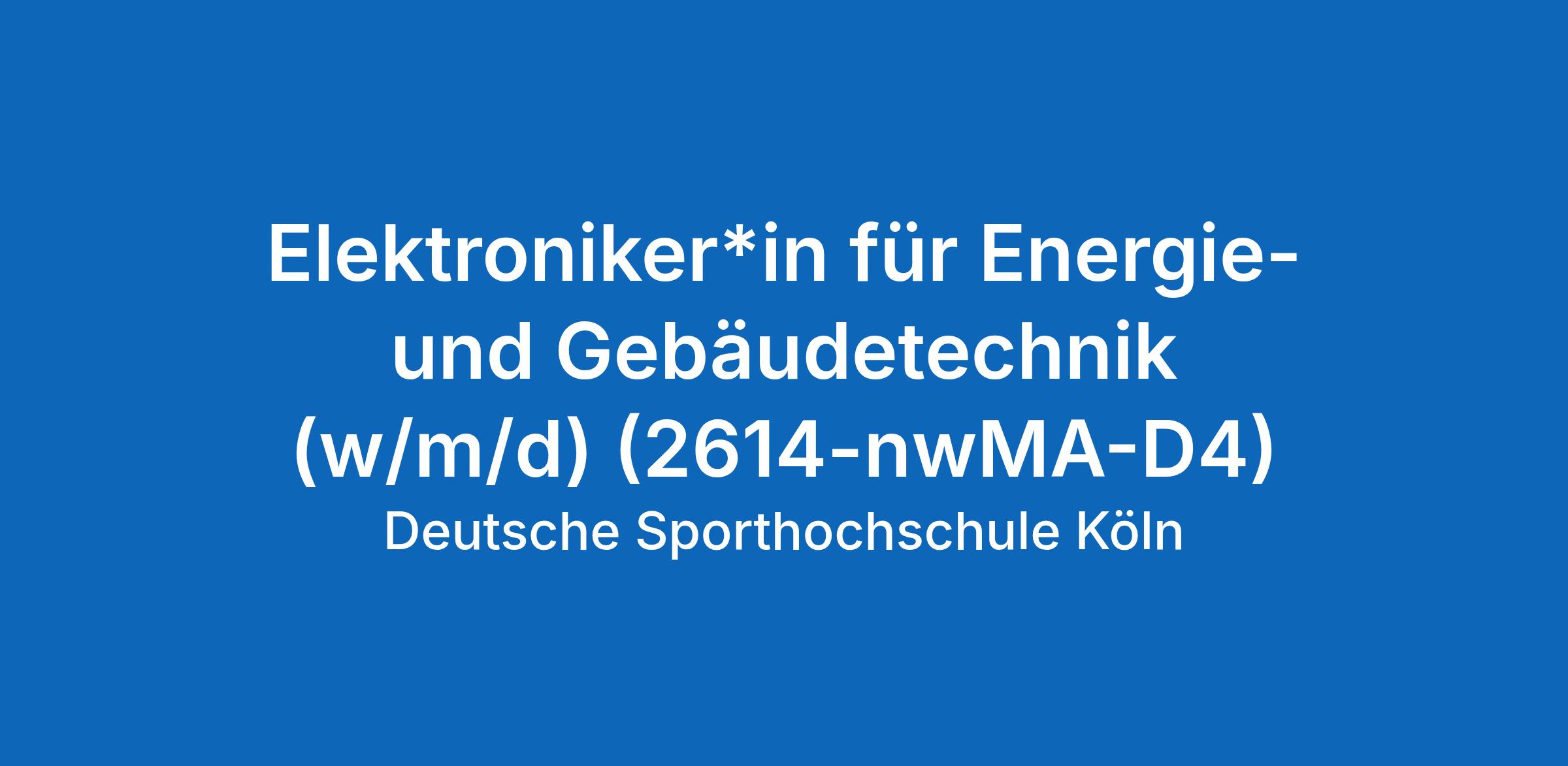Die Deutsche Sporthochschule Köln ist als Universität des Landes Nordrhein-Westfalen in ihrem Forschungsspektrum und mit rund 6.000 Studierenden in Deutschland einzigartig. Sie gehört auf ihrem Gebiet auch international zu den renommiertesten Universitäten. Im Dezernat für Bauangelegenheiten und Gebäudemanagement, Abteilung Technisches Gebäudemanagement ist zum nächstmöglichen Zeitpunkt eine Stelle als Elektroniker*in für Energie- und Gebäudetechnik (w/m/d) zu besetzen.