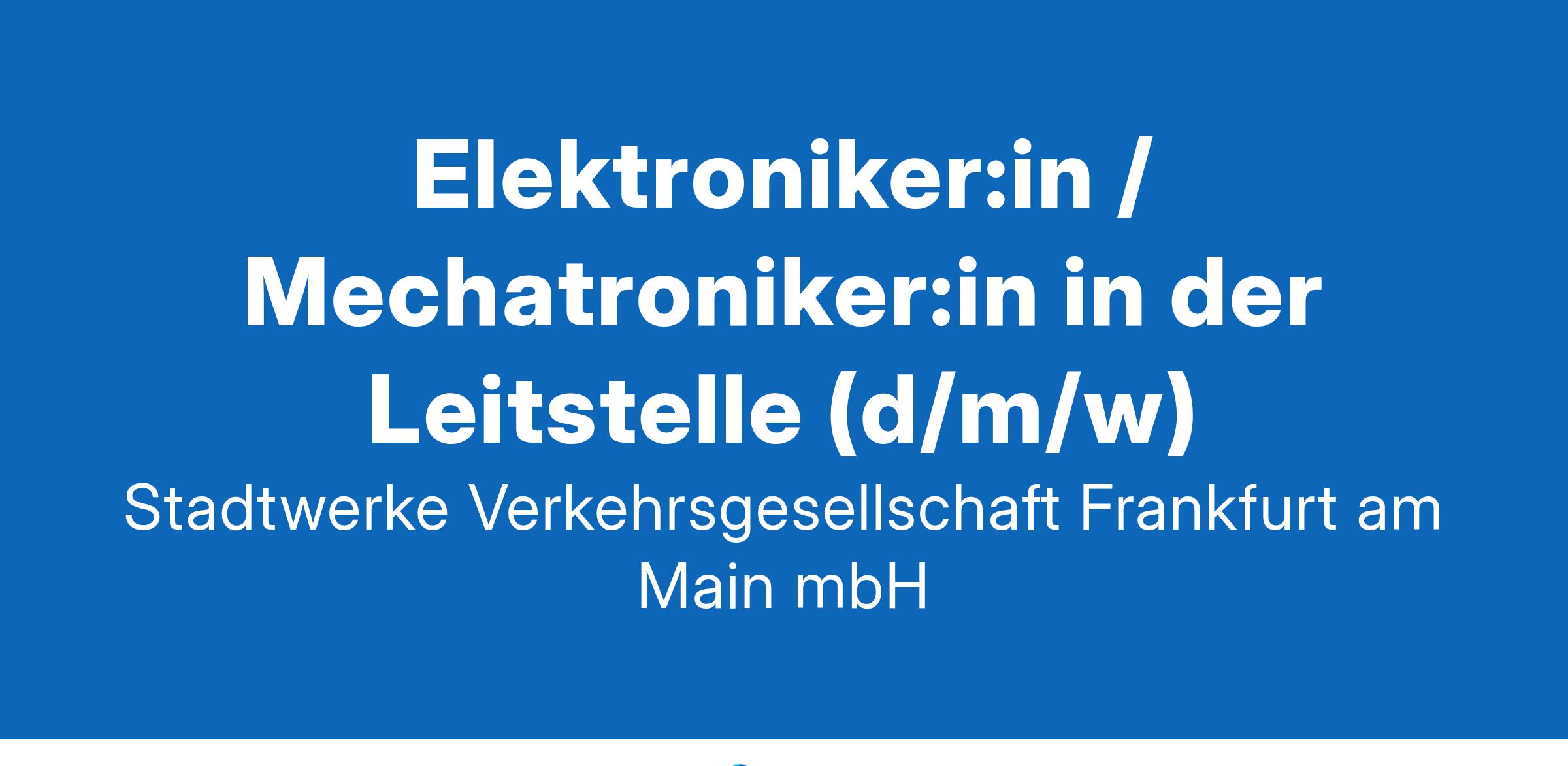 Elektroniker:in / Mechatroniker:in in der Leitstelle (d/m/w)WIR BEWEGEN MENSCHENAls Verkehrsdienstleisterin arbeiten wir an der Zukunft Frankfurts - als Arbeitgeberin kümmern wir uns mit Ihnen um Ihre Zukunft. Darum leben wir in unserem Unternehmen Offenheit, Toleranz und Gleichberechtigung und unterstützen Sie mit vielfältigen Benefits. Wir glauben: Der Nahverkehr ist die Zukunft der Mobilität. Deswegen entwickeln wir mit Leidenschaft neue Ideen und Konzepte.