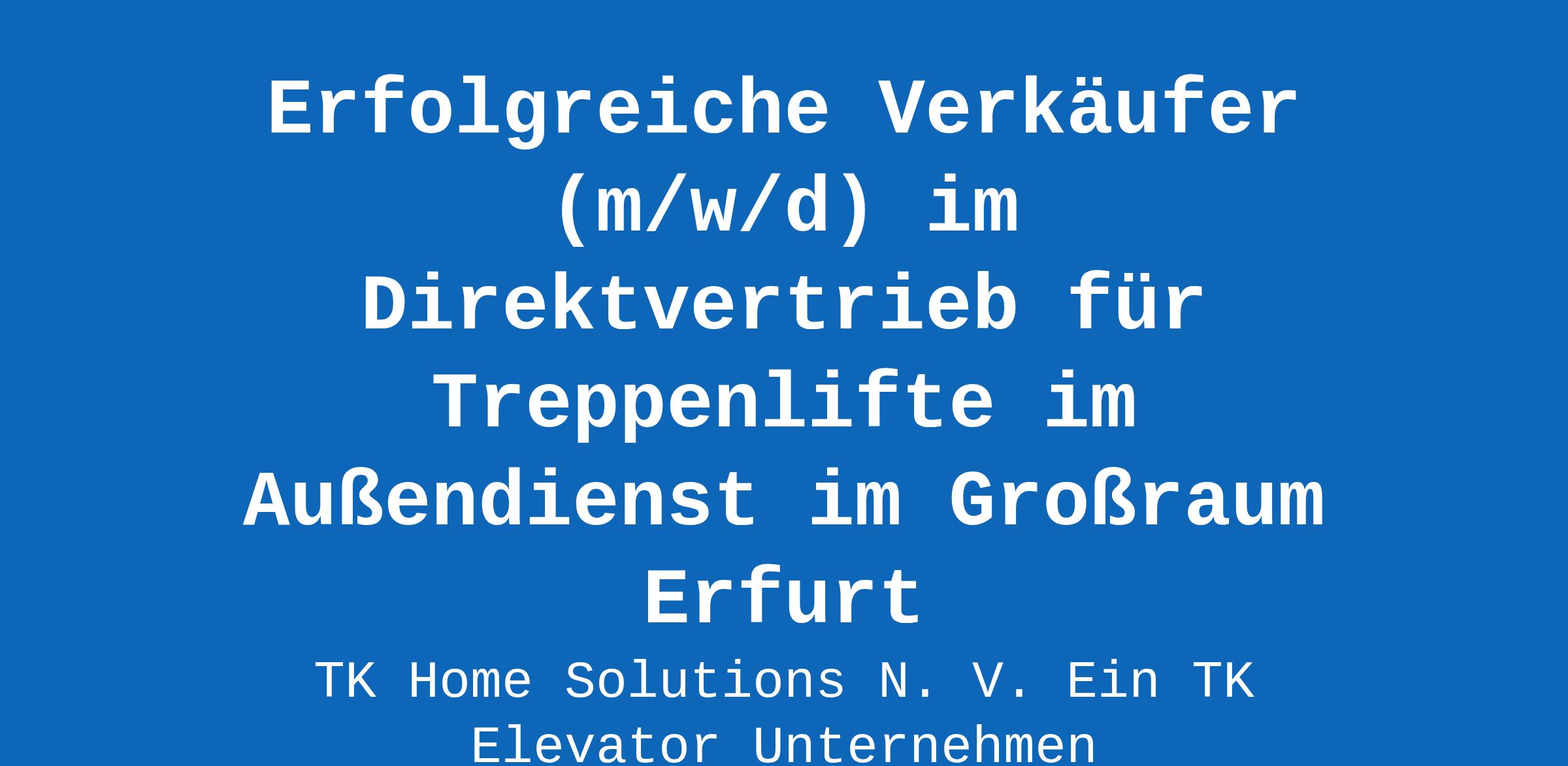 Die TK Home Solutions N.V. ist eine Gesellschaft innerhalb des TK Elevator Konzerns und ein Teil der Business Unit Home Solutions. Wir sind einer der führenden Anbieter von hochwertigen Treppenliftanlagen, bei denen unser innovatives Verkaufswerkzeug HoloLinc® zum Einsatz kommt. Unser Name steht ... Kundenerfahrung;Kundentermine;Deutsch;Vertrieb;Vertrieb;Treppenliftverkauf;Direktvertrieb;Außendienst;Erfolgsorientiert;Montagearbeiten;Messtechnik;Kundenbesuche;Beratung Original Stellenanzeige auf StepStone.de – Jetzt Jobagent bei StepStone einrichten und Traumjob finden! https://bit.ly/2KOagYD Mehr Informationen zu Arbeitgebern, Gehaltsdaten und Karrieretipps finden Sie auf StepStone.de