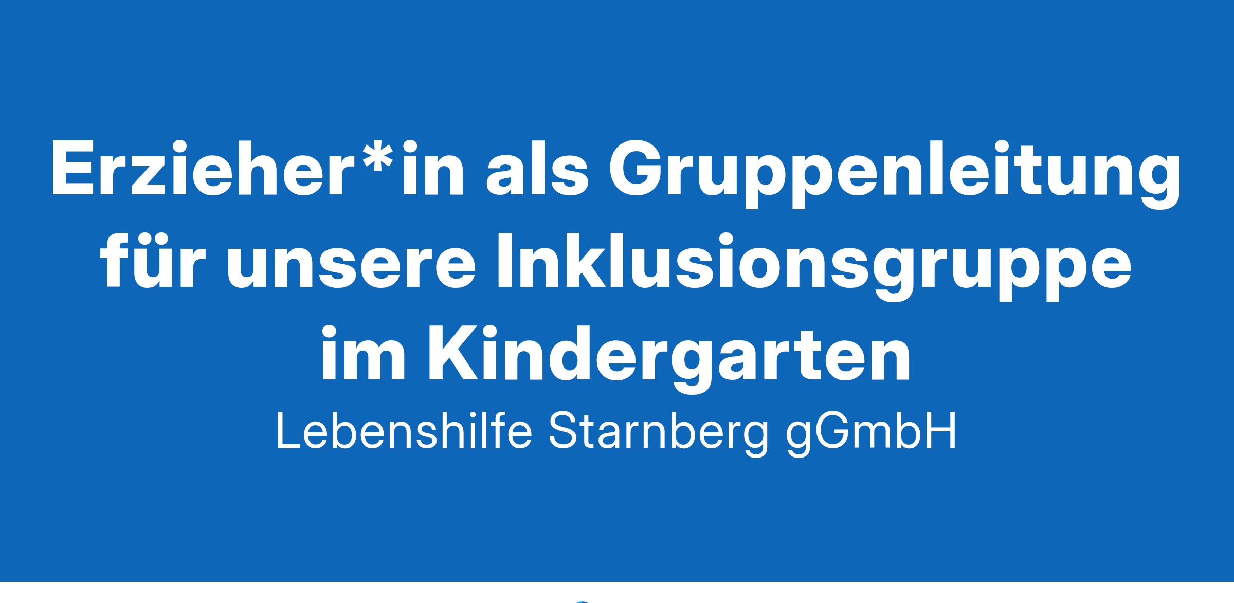 Erzieher*in als Gruppenleitung für unsere Inklusionsgruppe im KindergartenLebenshilfe Kinderhaus GautingIn unserem inklusiven Kinderhaus in Gauting fördern wir Kinder mit und ohne Behinderung vom ersten Lebensjahr bis zur 4. Klasse. Im Kindergarten bieten wir in jeweils zwei Gruppen bis zu 50 Kindern einen Platz. Kinder mit Behinderung werden vorzugsweise in Integrationsgruppen mit einer geringeren Gruppenstärke mit bis zu 17 Kindern gefördert und betreut. Unser Anliegen ist es, Familien in der Erziehung und Betreuung ihrer Kinder zu unterstützen.