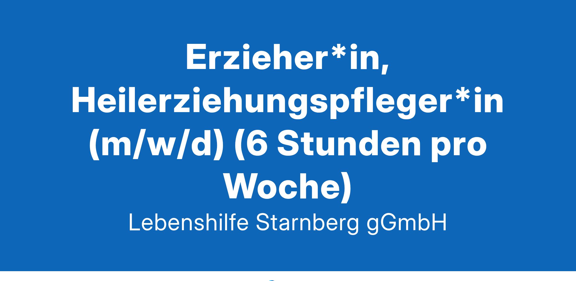 Erzieher*in, Heilerziehungspfleger*in (m/w/d) (6 Stunden pro Woche)Heilpädagogischer Kindergarten AndechsIn unserem heilpädagogischen Kindergarten in Andechs betreuen und fördern wir in zwei Gruppen 18 Kinder mit Entwicklungsverzögerungen und Verhaltensauffälligkeiten im Alter zwischen drei und sieben Jahren. Neben einer differenzierten und abgestimmten Förderung im Gruppengeschehen werden die Kinder zusätzlich durch einen interdisziplinär besetzten Fachdienst therapeutisch unterstützt. Eine enge An- und Einbindung der Eltern und Bezugspersonen ist ein weiterer integraler Bestandteil unserer Arbeit.Beschäftigungsmaß6 WochenstundenWir bietenDie Mitarbeit in einem mittelständischen Unternehmen mit 17 Einrichtungen und 350 Mitarbeitenden
