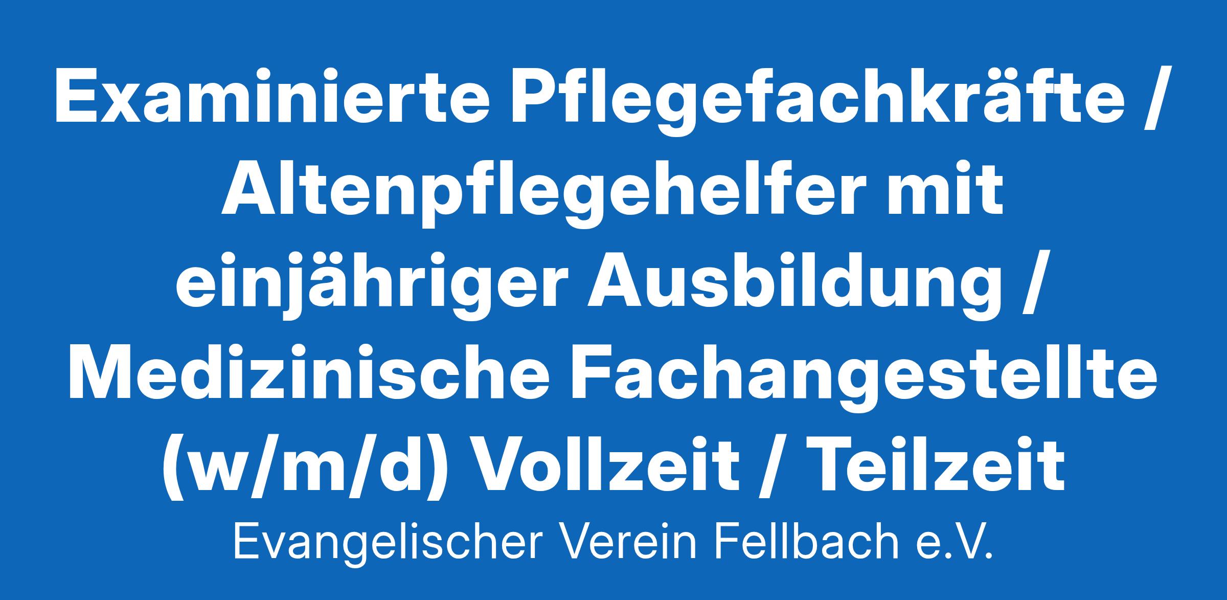 in Voll- und Teilzeit (20 – 100 %) Sie erhalten von uns: Alle Vorzüge eines unbefristeten und tarifgebundenen Arbeitsplatzes: Gehaltsgruppe P 8 (Pflegefachkräfte) bzw. P6 | Jahressonderzahlung | Schicht- und Zeitzuschläge | Leistungszulage | Zusatzversorgungskasse (Betriebsrente) Gute Rahmenbedingungen: Schichtplan mit Früh- und Spätdienst bei einer 39-Stunden-Woche | 3-Monats-Dienstplan | 3 Tage Zusatzurlaub | Einarbeitung | respektvolles Arbeitsklima | digitale Zeiterfassung | Fort- und Weiterbildungsmöglichkeiten mit Aufstiegs- und Qualifikationschancen | Zuschuss zum Deutschlandticket | Einkaufsvergünstigungen (corporate benefits) Angebot einer 2-Zimmer-Wohnung in Fellbach zur Miete oder Unterstützung bei der Wohnungssuche | Hilfe bei der Organisation der Kinderbetreuung Sie übernehmen: Fachgerechte Durchführung von ambulanter Grund- und Behandlungspflege Pflegedokumentation Sicherstellung des Informationsaustausches zwischen Klienten, Angehörigen, Hausärzten und Diakoniestation Sie bringen mit: Abgeschlossene Berufsausbildung, sehr gerne auch Berufsanfänger und Wiedereinsteiger Verständnis und Achtung gegenüber den christlichen Werten unserer diakonischen Einrichtung Führerschein Kl. B Wir freuen uns auf Ihre Bewerbung! Telefonisch: Bei Frau Marion Öttl aus der Personalabteilung unter 0711/585676-19 E-Mail: Unterlagen nur im PDF-Format an bewerbung[AT]ev-fellbach.de oder direkt über die Homepage Post: Evangelischer Verein Fellbach e.V., Mozartstr. 14, 70734 Fellbach