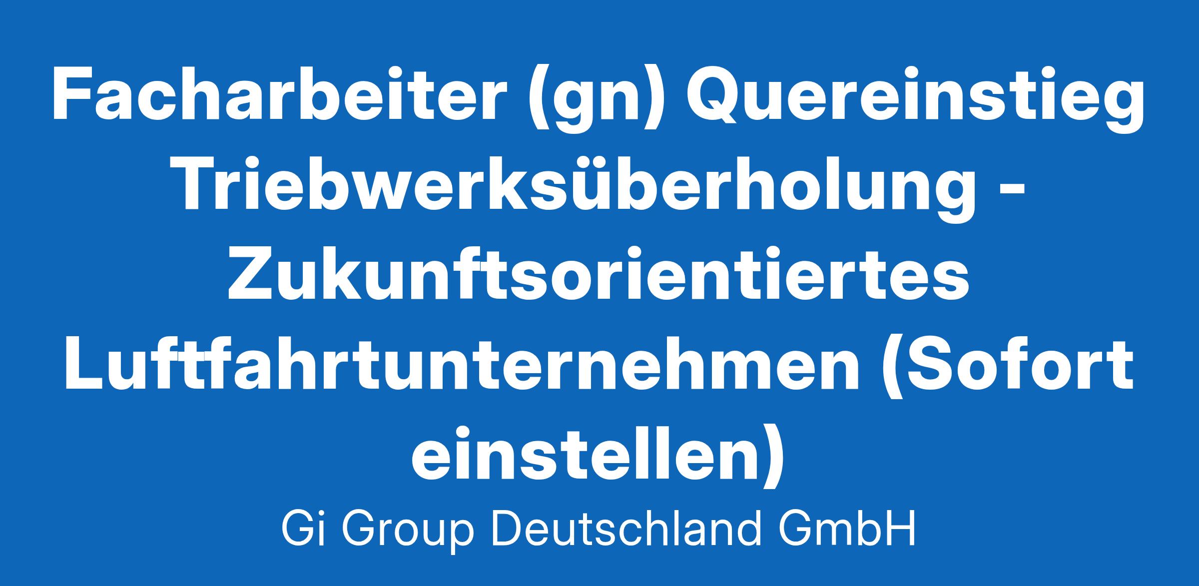 Facharbeiter (gn) Quereinstieg Triebwerke ab sofort in Vollzeit in Hamburg in der Direktvermittlung Die Gi Group ist ein international agierender Personaldienstleister mit mehr als 500 Standorten in 40 Ländern. Unser Kunde ist ein renommiertes und zukunftsorientiertes Unternehmen aus der Luftfahrt. Deine Aufgaben Demontage und Montage von Triebwerken und Triebwerksmodulen Mechanische Reparaturarbeiten von Triebwerkseinzelteilen, auch im Team, durchführen Triebwerke sowie deren Bauteile bereitstellen und befunden Dein Profil Eine abgeschlossene Berufsausbildung in einem metallverarbeitenden Beruf, z.B. Kfz-Mechatroniker, Anlagenmechaniker, Industriemechaniker, Feinwerkmechaniker, Konstruktionsmechaniker, Werkzeugmacher, Metallbauer oder eine abgeschlossene Berufsausbildung in einem anderen handwerklichen Beruf, z.B. Holzhandwerk, Medizintechnik etc. Englischkenntnisse wünschenswert Bereitschaft zum Schichtdienst (verschiedene Schichtmodelle mit Zulagen) Das bietet der Kunde Urlaubs- und Weihnachtsgeld sowie eine Gewinnbeteiligung, 30 Tage Urlaub Flugvergünstigungen, Einkaufsrabatte in Geschäften und Jobrad-Leasing Kostenloses Parken, betriebliche Altersvorsorge und Verpflegungszuschuss für die Kantine Fitness- und Sportangebote, Jobticket/Zuschuss ÖPNV Und vieles mehr Deine Bewerbung Für Deine Bewerbung als Facharbeiter im Quereinstieg in der Triebwerksüberholung klicke bitte einfach auf „Jetzt bewerben“. Dort kannst Du Deine Kontaktdaten eingeben sowie Deinen Lebenslauf und Deine Bewerbungsunterlagen hochladen. Du benötigst dafür nur ca. 1 Minute. Dein zuständiger Personaldisponent wird sich bei Dir schnellstmöglich melden. Gerne kannst Du uns auch Deine Bewerbungsunterlagen per E-Mail zusenden. Wir freuen uns auf Deine Bewerbung als Facharbeiter Quereinstieg in der Triebwerksüberholung! Unsere Stellenangebote richten sich an Arbeitssuchende jeglichen Geschlechts. (gn) = geschlechtsneutral. Kontakt Gi Group Recruiting Team