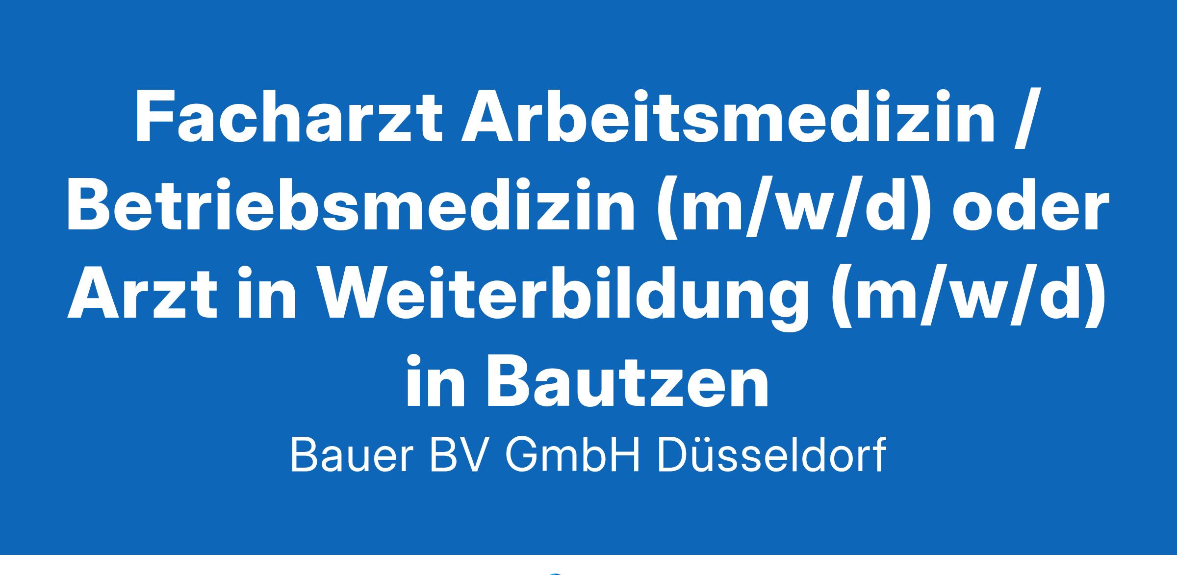 Anstellungsart(en): Teilzeit, VollzeitIhr neuer Arbeitsplatz:Großer, bundesweit führender Anbieter im betrieblichen Gesundheits- und Leistungsfähigkeitsmanagement. Für den Standort Bautzen suchen wir zum nächstmöglichen Zeitpunkt einen Facharzt (m/w/d) für Arbeitsmedizin bzw. Betriebsmedizin oder gerne auch einen Assistenzarzt (m/w/d).Ihre Vorteile:Attraktive KarrieremöglichkeitenAbwechslungsreiche TätigkeitAusschließlich präventive TätigkeitBetreuung und Beratung der Kunden zu arbeitsmedizinischen ThemenKeine VertriebstätigkeitenFlexiblen ArbeitszeitenBesonders wertschätzenden AtmosphäreFreundliches und engagiertes TeamAttraktive VergütungDienstwagen, auch zur privaten NutzungUnbefristete Festanstellung in Voll- oder TeilzeitIhr Profil:Facharzt (m/w/d) für Arbeitsmedizin / Betriebsmedizin bzw.Arzt (m/w/d) mit 24 Monaten Erfahrung in den Gebieten der unmittelbaren PatientenversorgungPKW-FührerscheinIhr Ansprechpartner:Bauer B+V Personalberatung