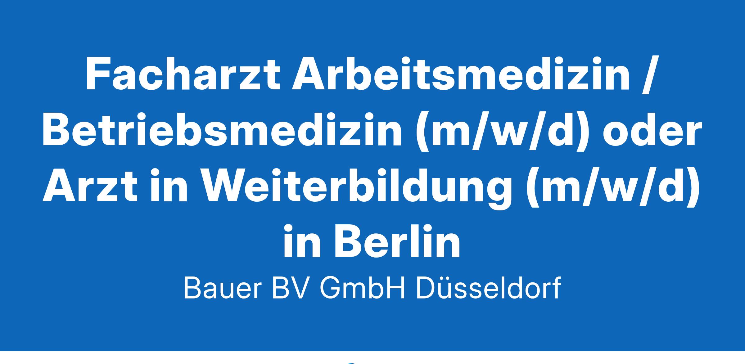 Anstellungsart(en): Teilzeit, VollzeitIhr neuer Arbeitsplatz:Großer, bundesweit führender Anbieter im betrieblichen Gesundheits- und Leistungsfähigkeitsmanagement. Für den Standort Berlin suchen wir zum nächstmöglichen Zeitpunkt einen Facharzt (m/w/d) für Arbeitsmedizin bzw. Betriebsmedizin oder gerne auch einen Assistenzarzt (m/w/d).Ihre Vorteile:Attraktive KarrieremöglichkeitenAbwechslungsreiche TätigkeitAusschließlich präventive TätigkeitBetreuung und Beratung der Kunden zu arbeitsmedizinischen ThemenKeine VertriebstätigkeitenFlexiblen ArbeitszeitenBesonders wertschätzenden AtmosphäreFreundliches und engagiertes TeamAttraktive VergütungDienstwagen, auch zur privaten NutzungUnbefristete Festanstellung in Voll- oder TeilzeitIhr Profil:Facharzt (m/w/d) für Arbeitsmedizin / Betriebsmedizin bzw.Arzt (m/w/d) mit 24 Monaten Erfahrung in den Gebieten der unmittelbaren PatientenversorgungPKW-FührerscheinIhr Ansprechpartner:Bauer B+V Personalberatung