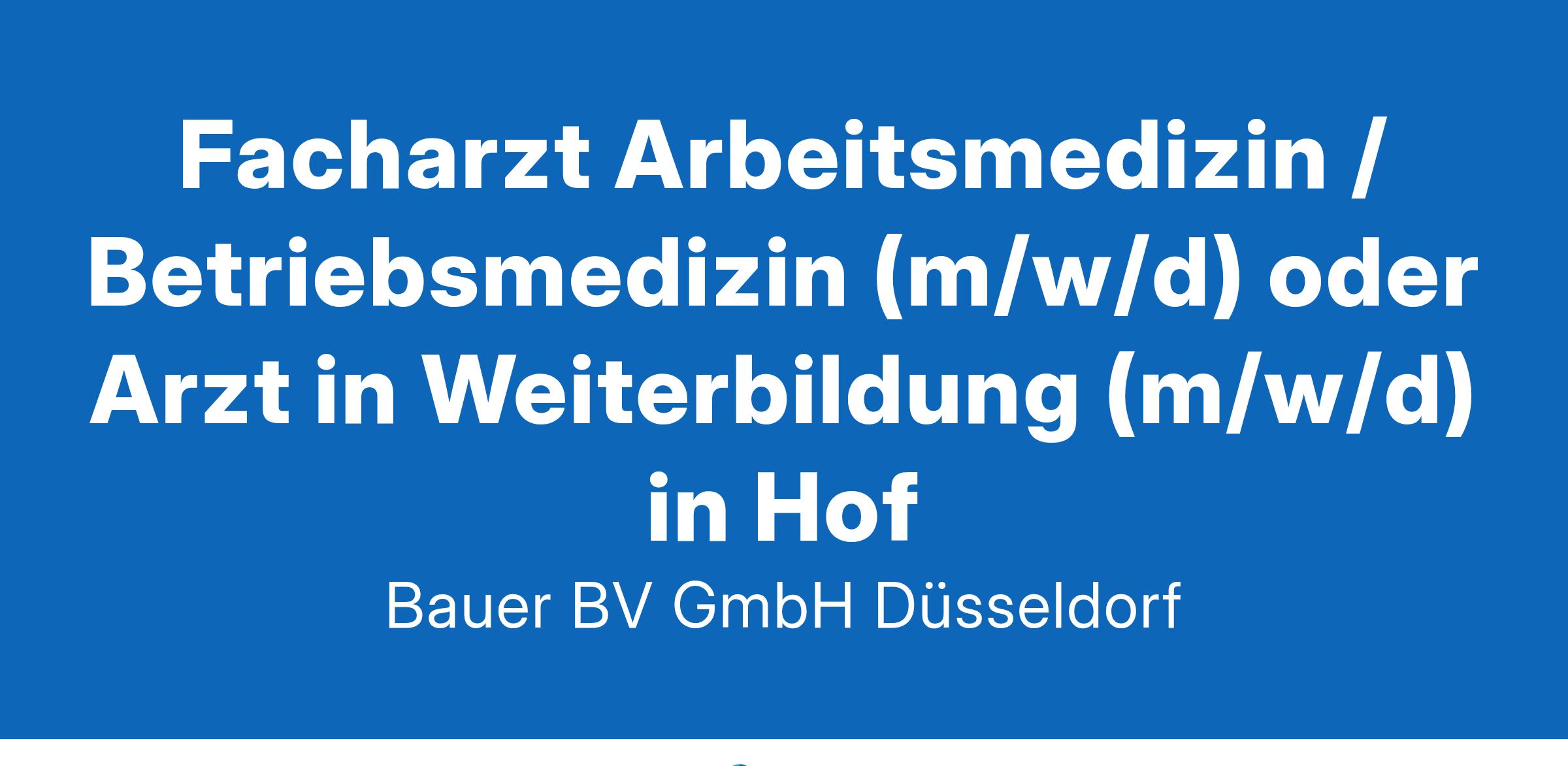 Anstellungsart(en): Teilzeit, VollzeitIhr neuer Arbeitsplatz:Großer, bundesweit führender Anbieter im betrieblichen Gesundheits- und Leistungsfähigkeitsmanagement. Für den Standort Hof suchen wir zum nächstmöglichen Zeitpunkt einen Facharzt (m/w/d) für Arbeitsmedizin bzw. Betriebsmedizin oder gerne auch einen Assistenzarzt (m/w/d).Ihre Vorteile:Attraktive KarrieremöglichkeitenAbwechslungsreiche TätigkeitAusschließlich präventive TätigkeitBetreuung und Beratung der Kunden zu arbeitsmedizinischen ThemenKeine VertriebstätigkeitenFlexiblen ArbeitszeitenBesonders wertschätzenden AtmosphäreFreundliches und engagiertes TeamAttraktive VergütungDienstwagen, auch zur privaten NutzungUnbefristete Festanstellung in Voll- oder TeilzeitIhr Profil:Facharzt (m/w/d) für Arbeitsmedizin / Betriebsmedizin bzw.Arzt (m/w/d) mit 24 Monaten Erfahrung in den Gebieten der unmittelbaren PatientenversorgungPKW-FührerscheinIhr Ansprechpartner:Bauer B+V Personalberatung