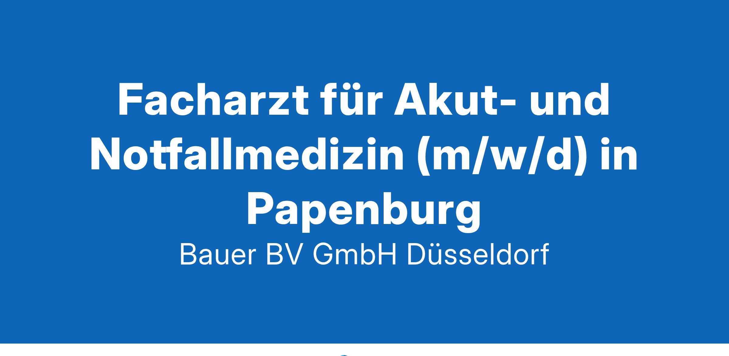 Anstellungsart(en): Teilzeit, VollzeitIhr neuer Arbeitsplatz:Krankenhaus der Grund- und Regelversorgung mit rund 180 Betten im Raum Papenburg. Die Zentrale Notaufnahme des Krankenhauses fungiert als eigenständige Abteilung und steht den Patient:innen 24 Stunden am Tag zur Verfügung.Ihre Vorteile:Interessantes AufgabengebietBetreuung der PatientenDiagnostik und TherapieZusammenarbeit mit dem RettungsdienstVerantwortungsvoller Arbeitsplatz mit Entwicklungsmöglichkeiten zur LeitungspositionInterdisziplinäre Zusammenarbeit mit anderen FachabteilungenTeilnahme am Notfalldienst bei InteresseFreundliches und engagiertes TeamUnterstützung und Förderung von WeiterbildungenAttraktive VergütungUnbefristete Festanstellung mit PerspektiveIhr Profil:Facharzt (m/w/d) für:Innere Medizin oderChirurgie / Unfallchirurgie oderAnästhesiologieZusatzbezeichnung "Klinische Akut- und Notfallmedizin"Erfahrung in der NotaufnahmeDeutsche ApprobationSprachkenntnisse mind. auf B1-NiveauEngagement und TeamfähigkeitIhr Ansprechpartner:Bauer B+V Personalberatung