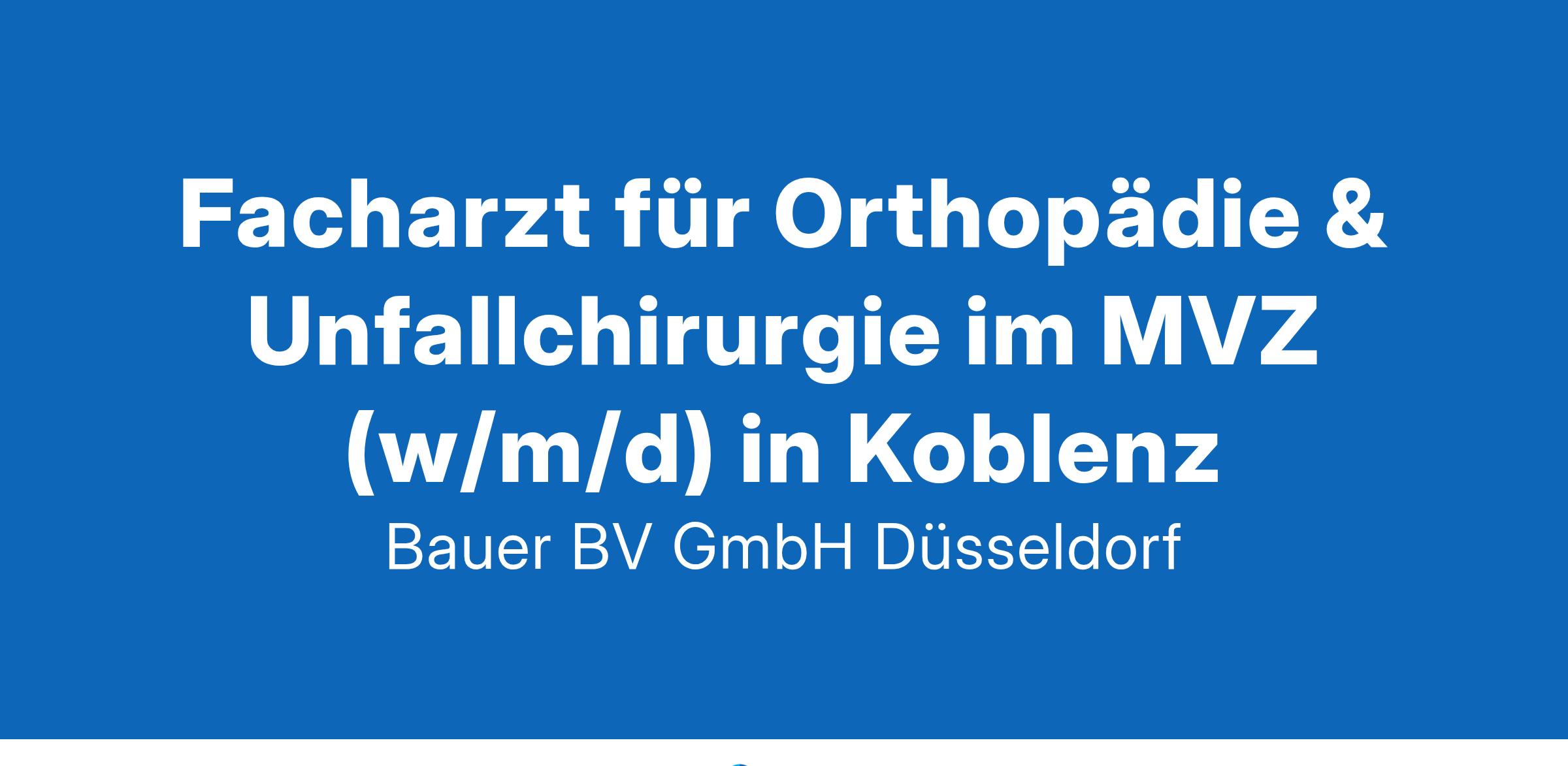 Anstellungsart(en): Teilzeit, VollzeitIhr neuer Arbeitsplatz:Das Medizinische Versorgungszentrum für Orthopädie liegt im Raum Koblenz und ist an ein Krankenhaus der Regelversogung angegliedert. Es werden alle gängigen Erkrankungen der Knochen, Gelenke, Muskeln und Sehnen mit allen modernen therapeutischen Verfahren behandelt.Ihre Vorteile:Modern ausgestattetes MVZAbwechslungsreiche und eigenverantwortliche TätigkeitUmfassende ambulante orthopädische Diagnostik und TherapiePraxismanagementMöglichkeit der operativen TätigkeitHohes Maß an fachlichem und strukturellen GestaltungsspielraumFort- und WeiterbildungenAttraktive VergütungUnbefristete Anstellung in Voll- oder TeilzeitIhr Profil:Facharzt für Orthopädie und Unfallchirurgie (m/w/d)Deutsche ApprobationSprachkenntnisse auf C1-NiveauEngagement und TeamfähigkeitIhr Ansprechpartner:Bauer B+V Personalberatung