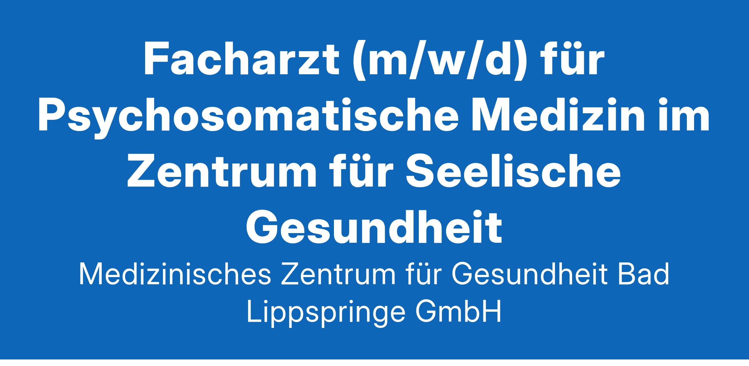 Facharzt (m/w/d) für Psychosomatische Medizin im Zentrum für Seelische GesundheitZum Zentrum für Seelische Gesundheit (ZSG) in Bad Lippspringe gehört die akut-psychiatrische Klinik für Seelische Gesundheit (KSG) sowie die Klinik am Park (KAP), eine Rehabilitationsklinik für Psychosomatik und Entwöhnungsbehandlung. Die Klinik für Seelische Gesundheit (KSG) hat einen Voll- und Pflichtversorgungsauftrag. Sie besteht aus Institutsambulanz, Tagesklinik (12 Plätze) und stationärem Bereich (40 Betten, im Aufbau).Wir suchen zum nächstmöglichen Termin einen Facharzt (m/w/d) für Psychosomatische Medizin.Ihre AufgabenPatientenbehandlung, incl. Visiten