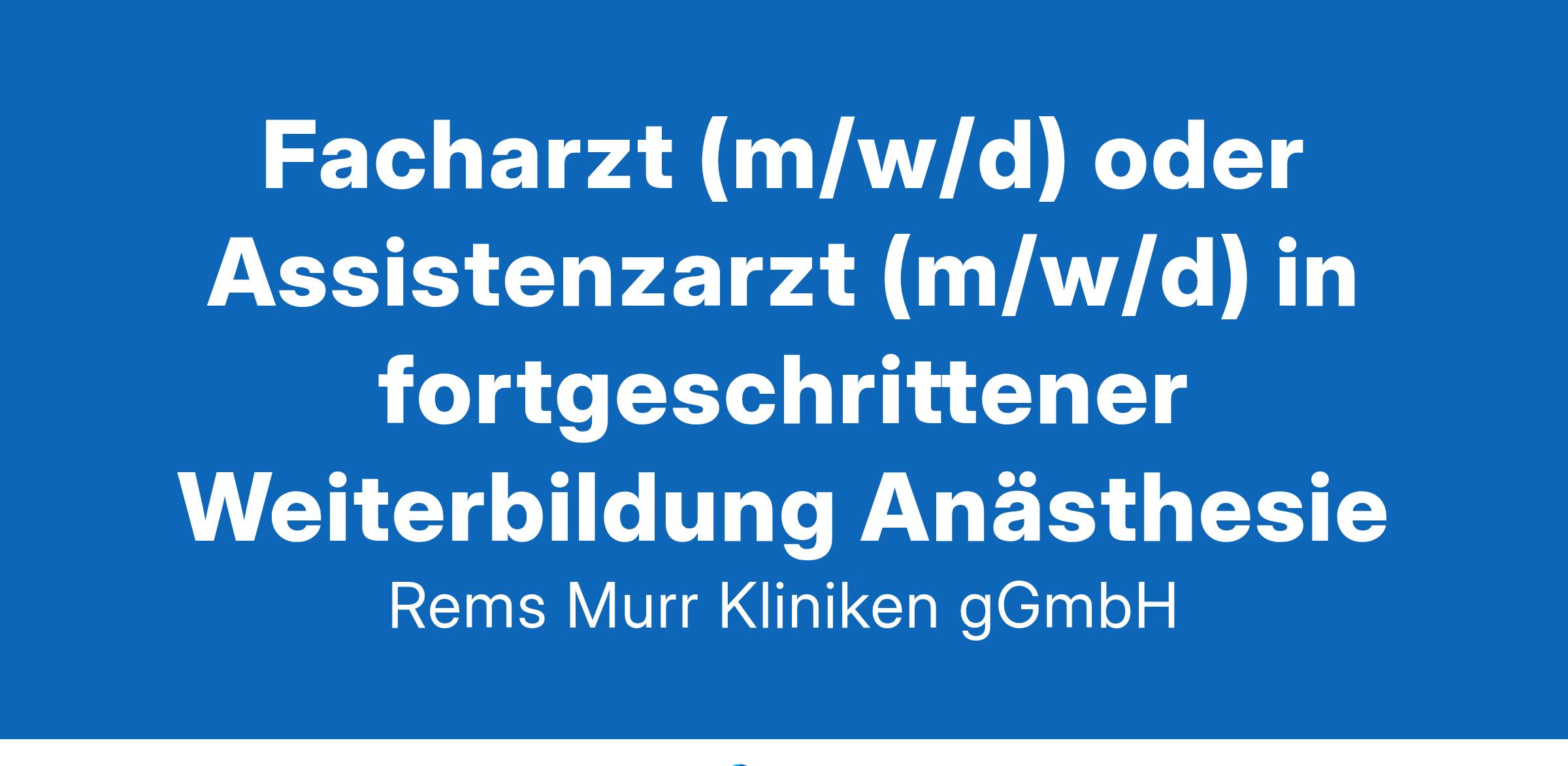 Facharzt (m/w/d) oder Assistenzarzt (m/w/d) in fortgeschrittener Weiterbildung Anästhesiefür unsere Klinik für Anästhesie, Intensiv- und NotfallmedizinReferenznummer: W-0-167-22In den Rems-Murr-Kliniken in Winnenden und Schorndorf werden in 21 Fachkliniken jährlich rund 51.000 Patientinnen und Patienten stationär versorgt. Mit ca. 2800 Mitarbeitenden gehören die Rems-Murr-Kliniken zu den größten Arbeitgebern in der Region.