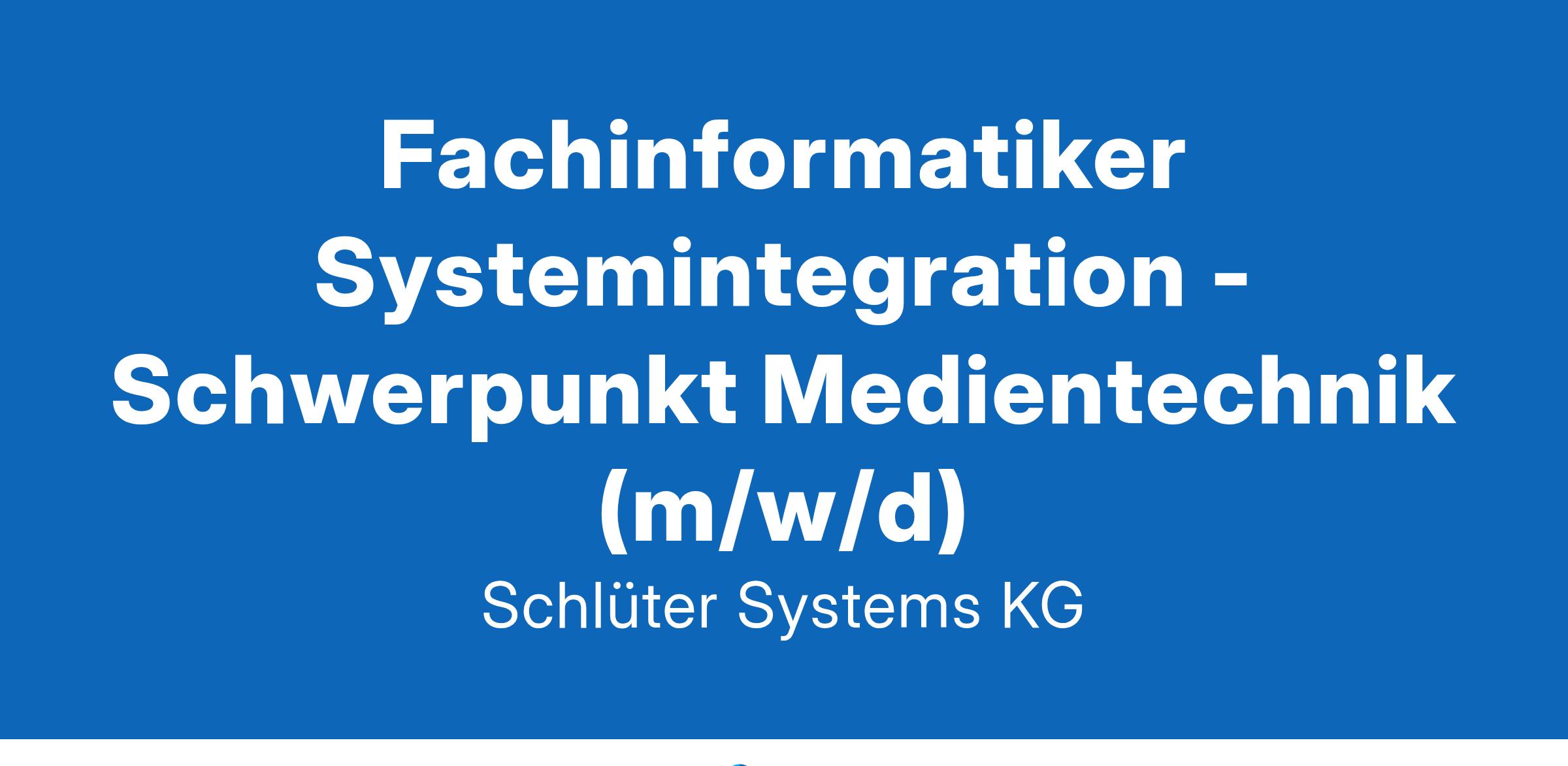 Fachinformatiker Systemintegration - Schwerpunkt Medientechnik (m/w/d)Als 1966 gegründetes und weltweit marktführendes Familienunternehmen entwickeln und produzieren wir innovative Systemlösungen für Wand- und Bodenbeläge in höchster Qualität. Von Iserlohn aus vermarkten wir unsere Produkte sehr erfolgreich und wachsen weltweit kontinuierlich. Dabei bauen wir seit jeher auf langfristige Partnerschaften mit unseren Kunden, Lieferanten und natürlich mit unseren Mitarbeitenden. Die Arbeit bei Schlüter-Systems ist geprägt durch die gesunde Mischung aus Innovation und Tradition in einem modernen Arbeitsumfeld. Wir vertrauen auf die Begeisterungsfähigkeit, Professionalität und Eigenverantwortlichkeit unserer Mitarbeitenden und stärken diese durch intensiven Wissens- und Informationsaustausch sowie Aus- und Weiterbildungsangebote. Werden auch Sie Teil der Schlüter-Familie!