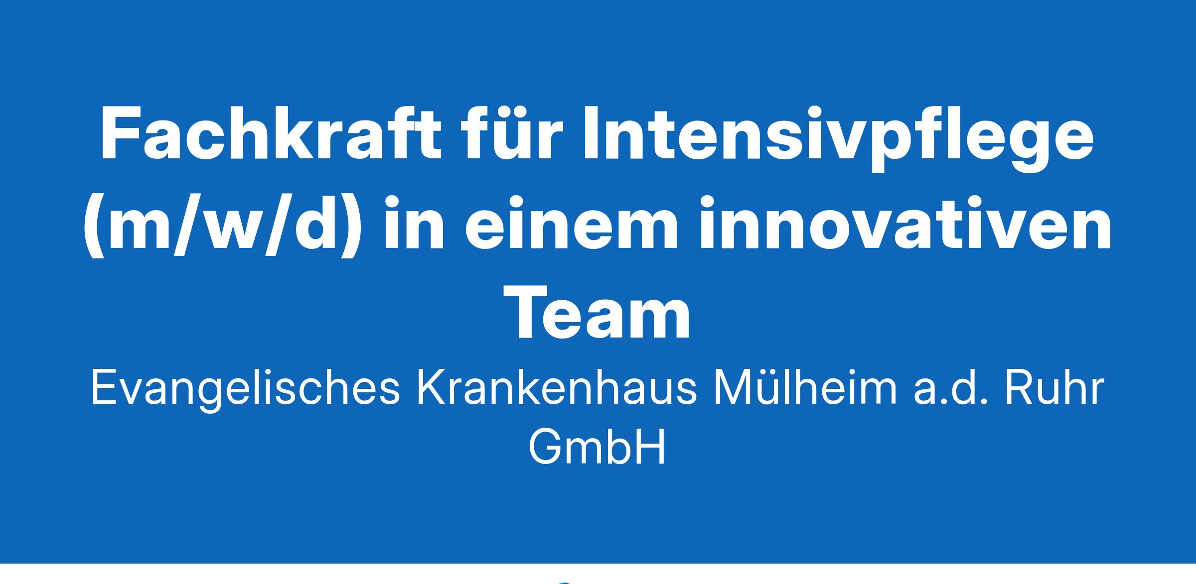 Karriere im Evangelischen Krankenhaus MülheimWir bieten unseren Mitarbeitenden ein professionelles und modernes Arbeitsumfeld. Ein angenehmes Arbeitsklima sowie ein guter Teamgeist sind für uns selbstverständlich. Die Kompetenz und die Motivation unserer Mitarbeitenden sind uns sehr wichtig: Daher unterstützen wir unsere Mitarbeitenden mit hochprofessionellen Fort- und Weiterbildungen in ihrer beruflichen und persönlichen Weiterentwicklung. In unseren Kliniken fühlen wir uns dem Menschen verpflichtet, unabhängig davon, ob es sich um Mitarbeitende, Patientinnen und Patienten oder um Angehörige handelt. Unser Miteinander gestalten wir auf Basis unserer gemeinsamen Werte. Das heißt unter anderem, dass wir jedem Menschen mit Respekt begegnen, in den offenen Austausch gehen und verlässlich in unseren Entscheidungen sind. Wir übernehmen Verantwortung gegenüber Anderen und gestalten gemeinsam nachhaltig unsere Zukunft. Zur Verstärkung und Unterstützung unseres Pflegeteams auf der Intensivstation suchen wir zum nächstmöglichen Zeitpunkt eine Pflegefachkraft (m/w/d)