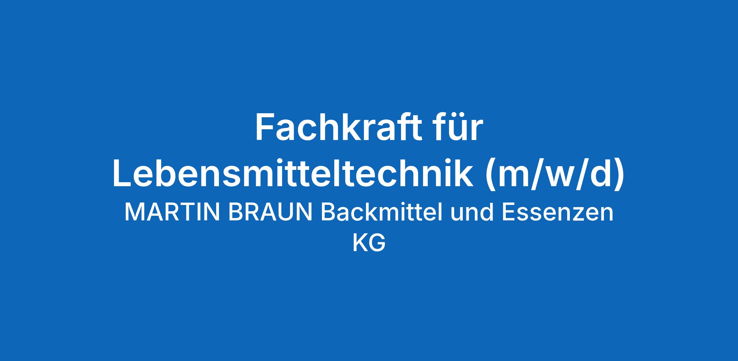 MARTIN BRAUN ist ein führendes Familienunternehmen der Backzutaten-Branche und gehört zur international tätigen Martin Braun-Gruppe, die Teil der Oetker Collection KG ist. Über 16.000 backende Betriebe im In- und Ausland arbeiten mit Braun Markenprodukten. Um die Zukunft und den Erfolg unseres Unternehmens zu sichern, suchen wir Verstärkung – ganz nach unserem Motto: „Du & Wir. Zusammen erfolgreich!“