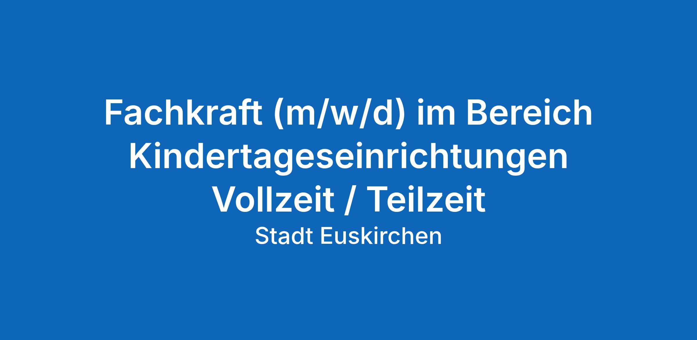 Die Stadt Euskirchen bietet Ihnen eine berufliche Zukunft bei 21 Kindertageseinrichtungen in städtischer Trägerschaft. Bei der Betreuung der ca. 1.200 Kinder setzt sie hierbei auf multiprofessionelle Teams. Um die vielfältigen Aufgabengebiete im Bereich der Kindertageseinrichtungen abzudecken, werden hier Fachkräfte, Ergänzungskräfte, hauswirtschaftliche Kräfte sowie Hausmeisterinnen und Hausmeister eingesetzt. Des Weiteren verfügt die Stadt Euskirchen über zwei eigene Fachberatungen und eine Sachgebietsleitung. Die Grundlage der Arbeit ist in der Trägerkonzeption sowie der Konzeption der städtischen Kindertageseinrichtungen festgeschrieben. Weitere Informationen hierzu erhalten Sie unter www.euskirchen.de.
