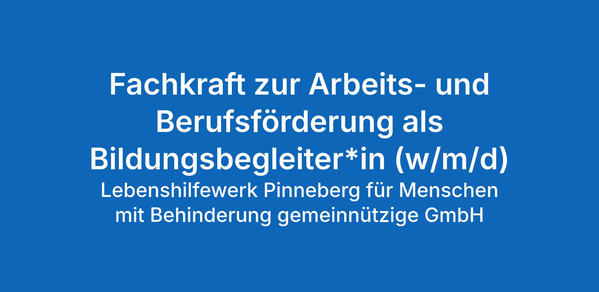 Wir suchen zum nächstmöglichen Zeitpunkt einen Bildungsbegleiter*in (w/m/d) mit einer durchschnittlichen wöchentlichen Arbeitszeit von 39 Stunden für das Lebenshilfewerk Pinneberg gGmbH.