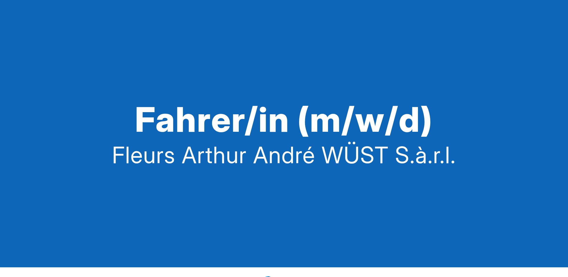 Fahrer/in (m/w/d) Wir suchen zur Unterstützung unseres Teams eine/n Fahrer(in) (m/w/d) unbefristet Mehrjährige Berufserfahrung Gute Deutsch- und Französischkenntnisse Tägliche Auslieferung der Blumen und Pflanzen an unsere Kunden Sie haben gute Kenntnisse der luxemburgischen Straßen Freundliches und korrektes Auftreten Sie sind interessiert? Dann senden Sie Ihre Bewerbung bitte an: Fleurs Arthur & André WÜST S.à.r.l. 11, rue de Mullendorf L-7329 Heisdorf-Steinsel oder per E-Mail an wust@pt.lu