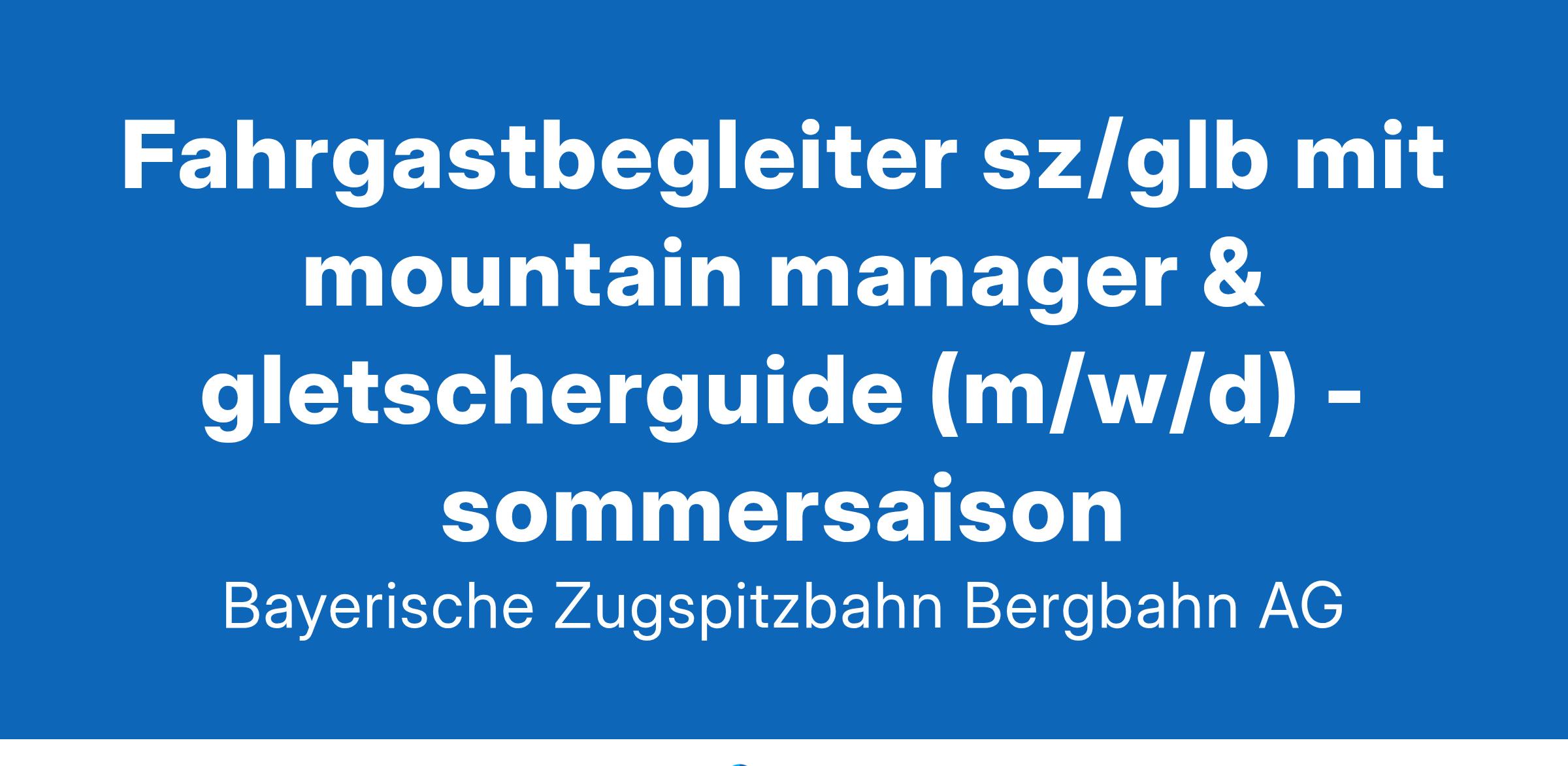 Sie möchten beruflich hoch hinaus? Sie bringen Berge voll Motivation mit und freuen sich auf ein angenehmes Arbeitsklima mit tollen Entwicklungschancen? Dann steigen Sie ein bei der Bayerischen Zugspitzbahn Bergbahn AG.Die Bayerische Zugspitzbahn Bergbahn AG ist ein modernes Dienstleistungsunternehmen mit insgesamt 27 Bergbahnen und Skiliften sowie neun unternehmenseigenen, gastronomischen Betrieben.Für unsere Geschäftseinheit Seilbahn Zugspitze suchen wir zum 01.03.2024 befristet für die Sommersaison eine/n Fahrgastbegleiter & Mountain Manager & Gletscherguide (m/w/d).FahrgastbegleiterBegleitung und Betreuung der Gäste an den Seilbahnen und bei der FahrgastlenkungMithilfe bei WartungsarbeitenDiv. Hilfstätigkeiten (Verladearbeiten, Schneeräumung; Transport von Wasser, Heizöl, etc.)Mountain ManagerBegleitung und Betreuung der Gäste - am Zugspitzplatt, Seilbahnen und FahrgastlenkungFührungen für Individual- und GruppengästeTägliche Betreuung des RodelhangsUnsere AnforderungenTechnisches VerständnisFreude am Umgang mit den Gästen - Dienstleister! (kommunikativ, teamfähig)Bereitschaft zum Schichtdienst (& Uuml;bernachtungen am Zugspitzgipfel)Körperliche BelastbarkeitLernbereitschaft und allumfassendes betriebliches InteresseGute Deutsch- und Englischkenntnisse (weitere Sprachkenntnisse von Vorteil)Wir bieten einen sicheren Arbeitsplatz in einem touristischen Umfeld mit verschiedenen betrieblichen Sozialleistungen wie z. B. Altersvorsorge, Zuschüsse, u. v. m.Wir freuen uns auf Ihre Bewerbung!Bitte bewerben Sie sich ausschließlich online und laden Ihre vollständigen Bewerbungsunterlagen hoch. Dies ermöglicht uns eine zügige Bearbeitung und schont die Umwelt. Für eine vollständige Bewerbung reichen Sie bitte neben Anschreiben und Lebenslauf immer auch Arbeitgeber- sowie Abschlusszeugnisse ein.Bayerische Zugspitzbahn Bergbahn AG | PersonalabteilungOlympiastraße 31 | 82467 Garmisch-PartenkirchenNicht die passende Stelle für Sie? Wenn Sie trotzdem hoch hinaus wollen, finden Sie weitere Jobs bei der Bayerischen Zugspitzbahn unter jobs.zugspitze.de.