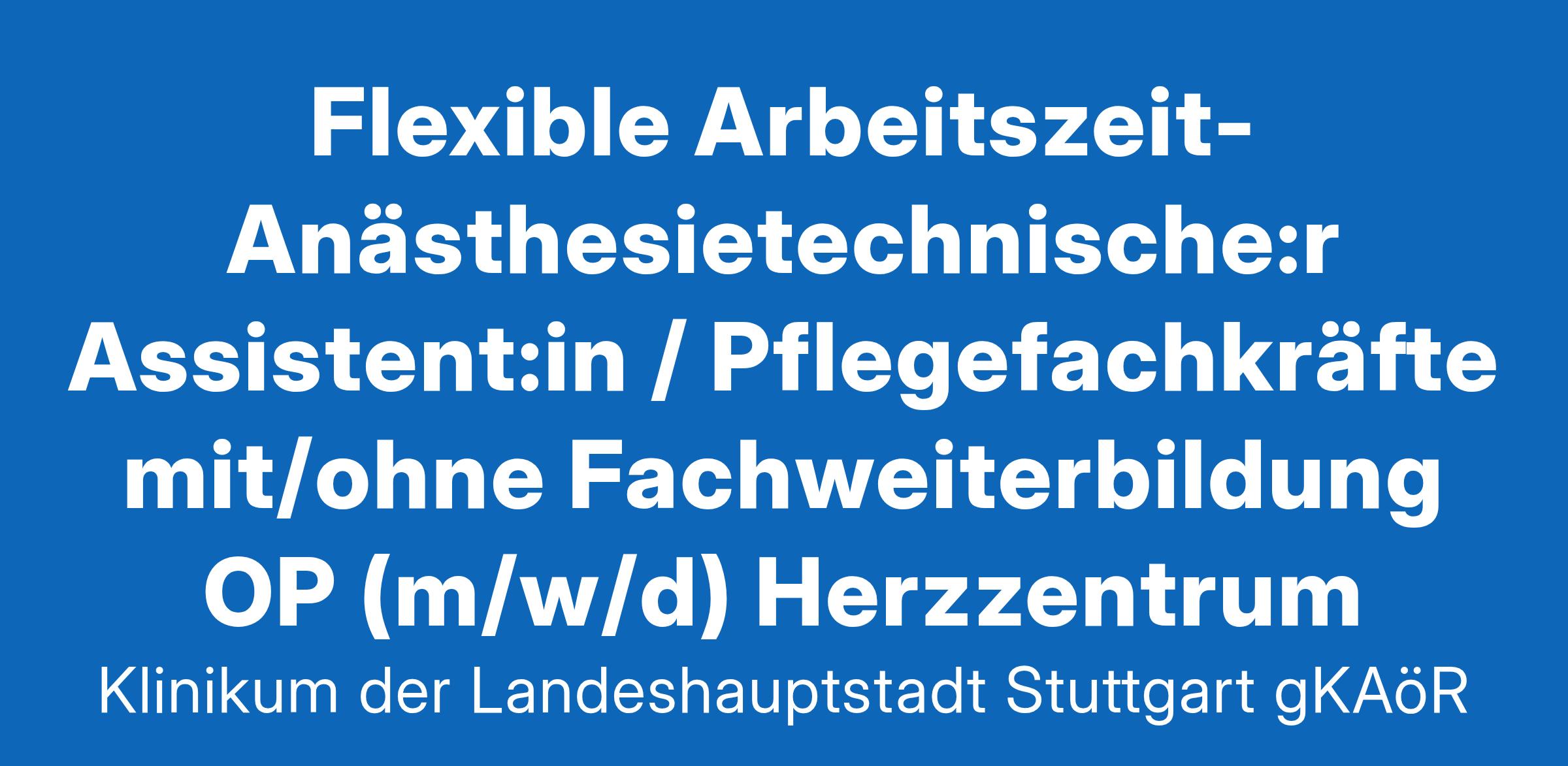 Klinikum Stuttgart - Entscheiden Sie sich für etwas Großes. Wir sind mit unseren drei Häusern „Katharinenhospital“, „Olgahospital“ und „Krankenhaus Bad Cannstatt“ das größte Klinikum in Baden-Württemberg. Über 9000 Mitarbeitende versorgen auf den Stationen, in Operationssälen, Funktionsbereichen die Patient:innen oder sind in Verwaltung, Technik oder IT für den reibungslosen Klinikbetrieb verantwortlich. An zwei attraktiv gelegenen Standorten in Stuttgart bieten wir Ihnen in über 50 Kliniken und Instituten als Maximalversorger und akademisches Lehrkrankenhaus der Universität Tübingen einen sinnstiftenden und zukunftsorientierten Arbeitsplatz. Dabei gilt immer: “Starkes Team. Starkes Klinikum. “Ihre Aufgaben: Für unser Zentrum für operative Medizin suchen wir ab dem nächstmöglichen Zeitpunkt eine:n qualifizierte:n Anästhesietechnische:n Assistent:in oder Pflegefachkräfte mit/ohne Fachweiterbildung Intensivpflege und Anästhesie (m/w/d) zur Unterstützung des pflegerischen Teams der Anästhesie im Herzzentrum.Ihr Aufgabengebiet im Funktionsdienst Anästhesie Herzchirurgie umfasst:Die Vorbereitung und Assistenz bei der Einleitung, Aufrechterhaltung und Ausleitung aller bekannten NarkoseverfahrenDie Kontrolle aller krankheits- und narkosespezifischer ParameterDie postoperative intensivmedizinische Überwachung mittels MonitoringDie Unterstützung von SchmerztherapienDie Dokumentation aller medizinisch-pflegerisch relevanter DatenDie Bedienung und Pflege medizinisch-technischer Geräte nach MPGUnterstützung bei der akuten NotfallversorgungDie Unterstützung bei der Lagerung von Patient*innenInterdisziplinäre Zusammenarbeit mit dem ärztlichen DienstWir erwarten:Sie sind examinierte: r Anästhesietechnische: r Assistent: in oder Pflegefachkraft (m/w/d) mit/ohne Fachweiterbildung Intensivpflege und AnästhesieSie verfügen über fachliche Kompetenz, haben Organisationstalent und VerantwortungsbewusstseinSie bringen Teamgeist und Freude am Umgang mit Menschen mitSie zeigen Bereitschaft und Fähigkeit zur interdisziplinären Zusammenarbeit sowie zu wirtschaftlichem und prozessorientiertem Handeln.Wir bieten:Ein verantwortungsvolles und vielseitiges AufgabengebietEine kooperative, vertrauensvolle Zusammenarbeit mit guter Arbeitsatmosphäre und Integration in ein multiprofessionelles und interprofessionelles TeamEin individuelles, strukturiertes und fachspezifisches EinarbeitungskonzeptUnterstützungsangebote zur Vereinbarkeit von Beruf und Familie:Familienfreundliche ArbeitszeitmodelleBetriebliche Kindertageseinrichtung und Möglichkeit der FerienbetreuungIndividuelle Begleitung bei der WiedereingliederungBei Tätigkeit im Springerpool: Dienstplan nach Wunsch und Möglichkeiten etc.Großes Angebot an innerbetrieblichen Aus-, Fort- und Weiterbildungsmöglichkeiten mit rund 120 Kursplätzen über unsere Akademie für Gesundheitsberufe sowie vielfältige AufstiegsmöglichkeitenRückzahlungsverpflichtungen aus einer Fachweiterbildung können ggf. übernommen werdenWeitere Leistungen: Betriebliches Gesundheitsmanagement, Sportangebote, vergünstigtes Essen im Betriebsrestaurant, kostenloses DeutschlandticketEine leistungsgerechte, tariflich abgesicherte Vergütung nach den Tarifverträgen des öffentlichen Dienstes (TVÖD)Eine überwiegend arbeitgeberfinanzierte betriebliche Altersvorsorge (ZVK)Ein unbefristetes ArbeitsverhältnisDie Stadt Stuttgart bietet als Großstadt vielseitige Kultur- und Freizeitangebote.Das Klinikum Stuttgart ist seit 2008 als familienfreundliches Unternehmen durch „Beruf und Familie GmbH“ zertifiziert.