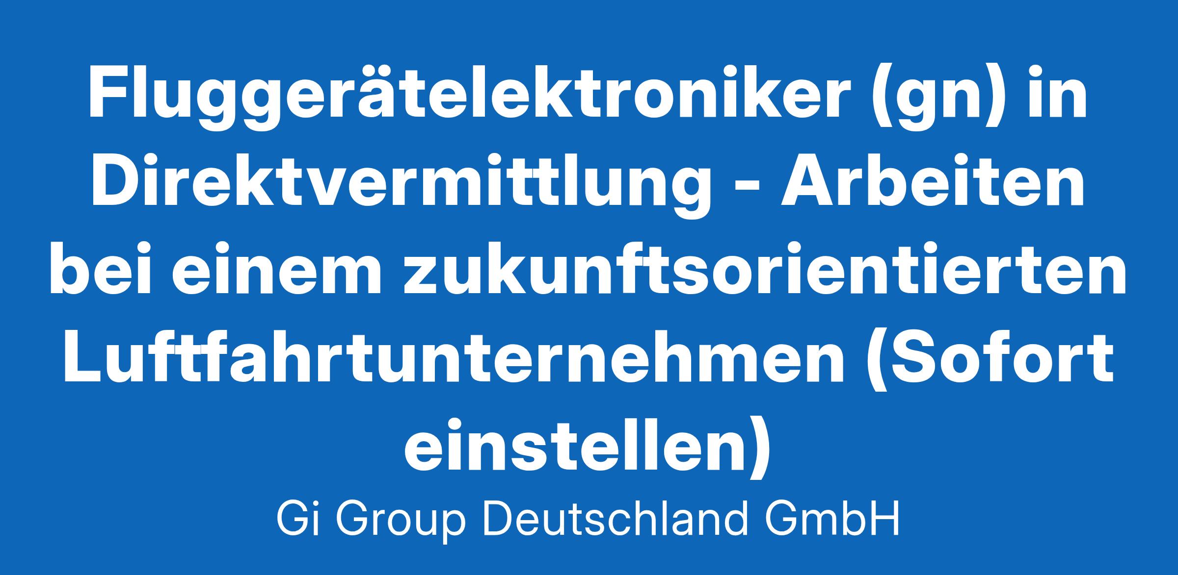 Fluggerätelektroniker (gn) in Direktvermittlung ab sofort in Vollzeit in Hamburg im Rahmen der Direktvermittlung Die Gi Group ist ein international agierender Personaldienstleister mit mehr als 500 Standorten in 40 Ländern. Unser Kunde ist ein renommiertes und zukunftsorientiertes Unternehmen aus der Luftfahrt. Deine Aufgaben Ausführung von Reparaturen an elektromechanischen Bauteilen und Geräten Fehlerdiagnosen an elektromechanischen Fluggeräten oder Baugruppen unter Anwendung von Messgeräten, Test- und Prüfeinrichtungen durchführen Mit technischen Unterlagen arbeiten und die Dokumentation entsprechend pflegen Dein Profil Eine abgeschlossene Berufsausbildung in einem luftfahrttechnischen Bereich, z.B. als Fluggerätelektroniker Alternativ ist eine abgeschlossene Berufsausbildung in einem Beruf mit Schwerpunkt Mechatronik, z.B. Mechatroniker, Elektromechaniker oder eine gleichwertige Qualifikation wünschenswert Fachkenntnisse in der Wartung, Instandhaltung und Montage Bereitschaft zum Erwerb fehlender Qualifikationen sowie zu berufsbezogener Weiterbildung Gute Englischkenntnisse Unser Angebot Urlaubs- und Weihnachtsgeld sowie eine Gewinnbeteiligung Flexible Arbeitszeiten (Gleitzeit, keine Schichtarbeit) und 30 Tage Urlaub Flugvergünstigungen, Einkaufsrabatte in Geschäften und Jobrad-Leasing Kostenloses Parken, betriebliche Altersvorsorge und Verpflegungszuschuss für die Kantine Deine Bewerbung Für Deine Bewerbung Fluggerätelektroniker in der Direktvermittlung klicke bitte einfach auf „Jetzt bewerben“. Dort kannst Du Deine Kontaktdaten eingeben sowie Deinen Lebenslauf und Deine Bewerbungsunterlagen hochladen. Du benötigst dafür nur ca. 1 Minute. Dein zuständiger Personaldisponent wird sich bei Dir schnellstmöglich melden. Gerne kannst Du uns auch Deine Bewerbungsunterlagen per E-Mail zusenden. Wir freuen uns auf Deine Bewerbung! Unsere Stellenangebote richten sich an Arbeitssuchende jeglichen Geschlechts. (gn) = geschlechtsneutral. Kontakt Gi Group Recruiting Team