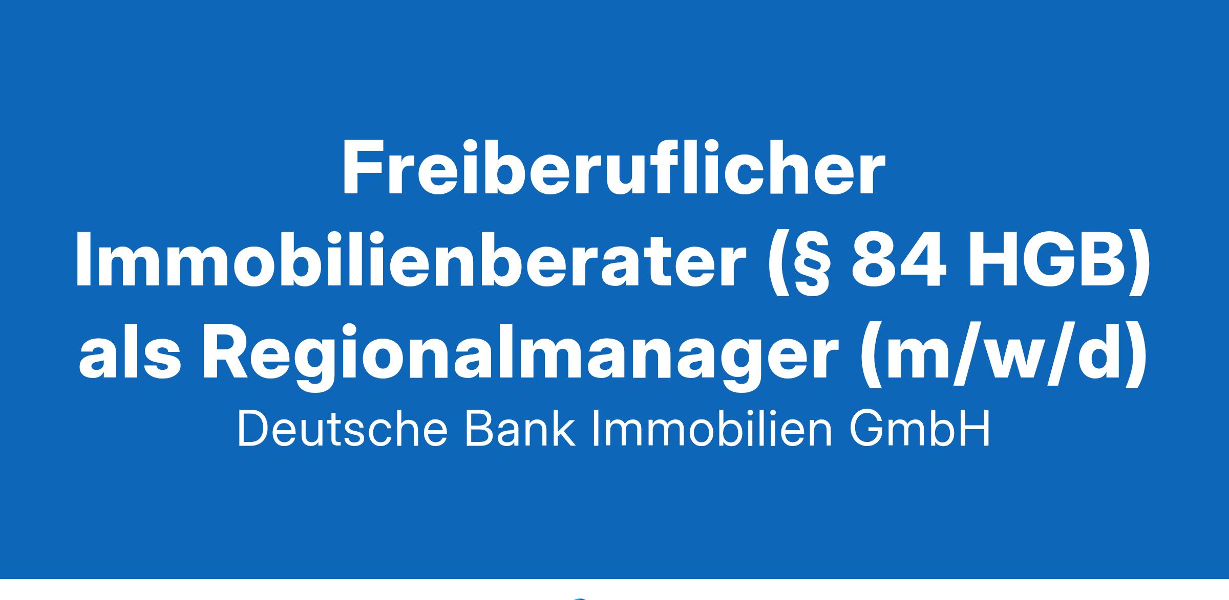 Deutsche Bank Immobilien GmbH ist bundesweit einer der größten Makler für privates Wohneigentum. Mit dem Expertenwissen der vergangenen vier Jahrzehnte deckt Deutsche Bank Immobilien professionell und umfassend alle Wünsche und Bedürfnisse rund um den Kauf und den Verkauf von Immobilien ab. Selbstständiger Immobilienmakler (§ 84 HGB) als Gebietsleiter (d/m/w), Immobilienvermittlung