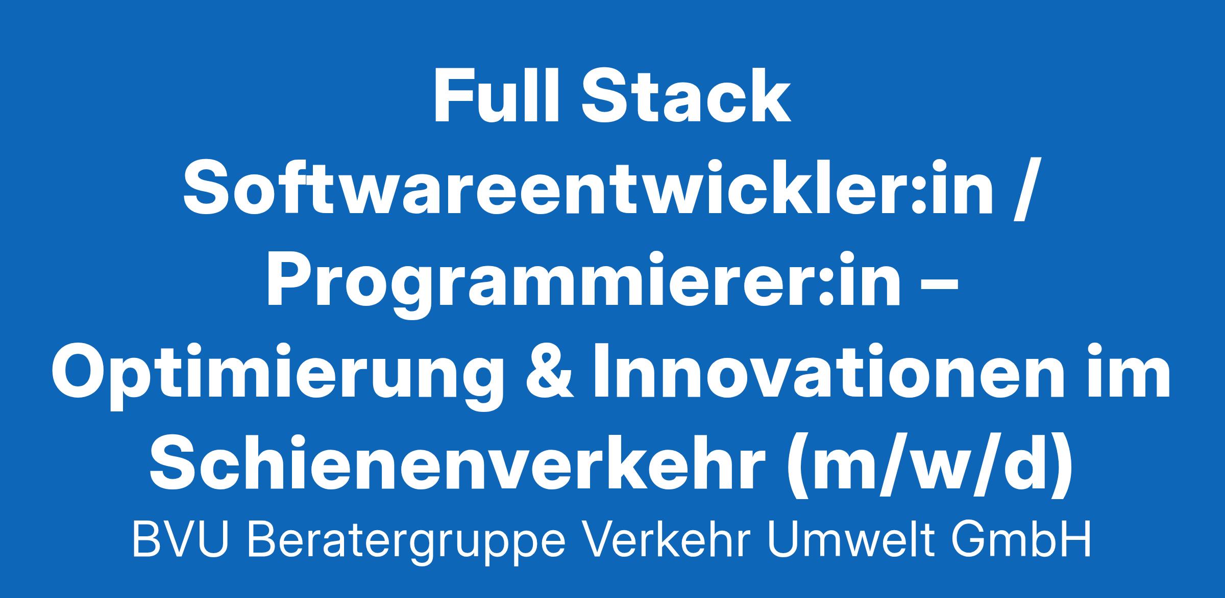 Full Stack Softwareentwickler:in / Programmierer:in – Optimierung & Innovationen im Schienenverkehr (w/m/d) in Freiburg im Breisgau (bis zu 50 % remote) Deine Aufgaben – dank dir machen wir Strecke Dein Beitrag zur Verkehrswende führt über dein Lieblingsthema: die Programmierung. Denn bei uns entwickelst Du anspruchsvolle, innovative Softwarelösungen, die Du auf die Anforderungen unserer Kunden abstimmst Dabei begleitest Du als Teil eines interdisziplinären, agilen Teams den gesamten Softwarelebenszyklus – von der Anforderungsanalyse über die Konzeption und dem Coding bis hin zum Testing sowie zur Inbetriebnahme. Zur Gestaltung von kundenspezifischen Frontend- und Backend-Lösungen nutzt und erweiterst Du stetig deinen Technologie-Stack sowie dein Know-how und stehst zudem in engem Austausch mit unseren Verkehrsingenieur:innen, die dir gerne mit Fachwissen rund um die Eisenbahn zur Seite stehen. Verantwortungsbewusst übernimmst Du die Qualitätssicherung der entwickelten Codes. Insbesondere beim Software-Testing und bei der finalen Abnahme bauen wir auf deine Expertise. Apropos Entwicklung: Durch den Austausch mit Kolleg:innen und Kundenfirmen sowie mithilfe fachspezifischer Weiterbildungen entwickelst Du dich stetig fort, sodass Du uns lernkompetent quasi mit Wissens-Updates versorgst. Dein Profil – das verleiht dir Triebkraft Ein abgeschlossenes Master-Studium in Informatik, Mathematik, Physik oder in einem vergleichbaren MINT-Fach; Absolvent:innen welcome! Erste Erfahrung in der forschungsnahen Programmierung, bestenfalls in einer objektorientierten Programmiersprache wie z. B. Java, Kotlin oder Python Bestenfalls Know-how im strukturierten Arbeiten mit der Scrum-Methode und Spaß an der Entwicklung komplexer Algorithmen Verhandlungssicheres Deutsch in Wort und Schrift (mindestens C1) Eine selbstständige Arbeitsweise, ein sehr hohes Qualitätsbewusstsein und Motivation, Dich und Dein Können im Teamwork einzubringen und Deinen fachlichen Horizont zu erweitern sowie Leidenschaft für das Thema Eisenbahn und (verkehrs-)technische Innovationen Erste Klasse – unsere Benefits Attraktives Gehalt und sichere Anstellung in einem wachsenden Unternehmen mit guter Auftragslage 30,5 Tage Urlaub (29 frei wählbare und 1,5 feste Urlaubstage), betriebliche Altersvorsorge und Unfallversicherung Gute Work-Life-Balance durch ein flexibles Gleitzeitmodell und Mobiles Arbeiten Individuelle Einarbeitung, konstruktives Feedback und interdisziplinäre Zusammenarbeit Angebote zur beruflichen Förderung, wie z. B. passgenaue, lerntypengerechte Weiterbildungen Geförderte Mobilität via BVU-JobRad und/oder Jobticket Zuschuss zur Kinderbetreuung (Kita- und Kindergartengebühren) und Hansefit-Mitgliedschaft Ergonomische Arbeitsplätze in umweltfreundlich klimatisierten Räumen (vorwiegend Einzel- und Zwei-Personen-Büros) Kostenfrei frisches Bio-Obst, Wasser, Säfte und Kaffee vom Feinsten Viele Standortvorteile: den Hauptbahnhof in Sichtweite, Top-Anschluss an den weiteren ÖPNV und nur 10 Gehminuten in die Freiburger Innenstadt Ein buntes und vielseitiges Freizeitangebot im Dreiländereck – hier kommen Familien, Sportbegeisterte und Genussmenschen auf Ihre Kosten. Gerne laden wir dich dazu ein, mit uns bei unseren vierteljährlichen Mitarbeiterevents unsere Stadt und die Region gemeinsam kennenzulernen. Unsere Personalreferentin Willma Kleis nimmt sich gerne unter Tel: (Inhalt entfernt) Zeit für dich. Offen, zukunftsorientiert und der Region verbunden – das und vieles mehr sind wir. Überzeuge dich selbst! Zur Onlinebewerbung BVU Beratergruppe Verkehr + Umwelt GmbH Wentzingerstraße (Inhalt entfernt) Freiburg