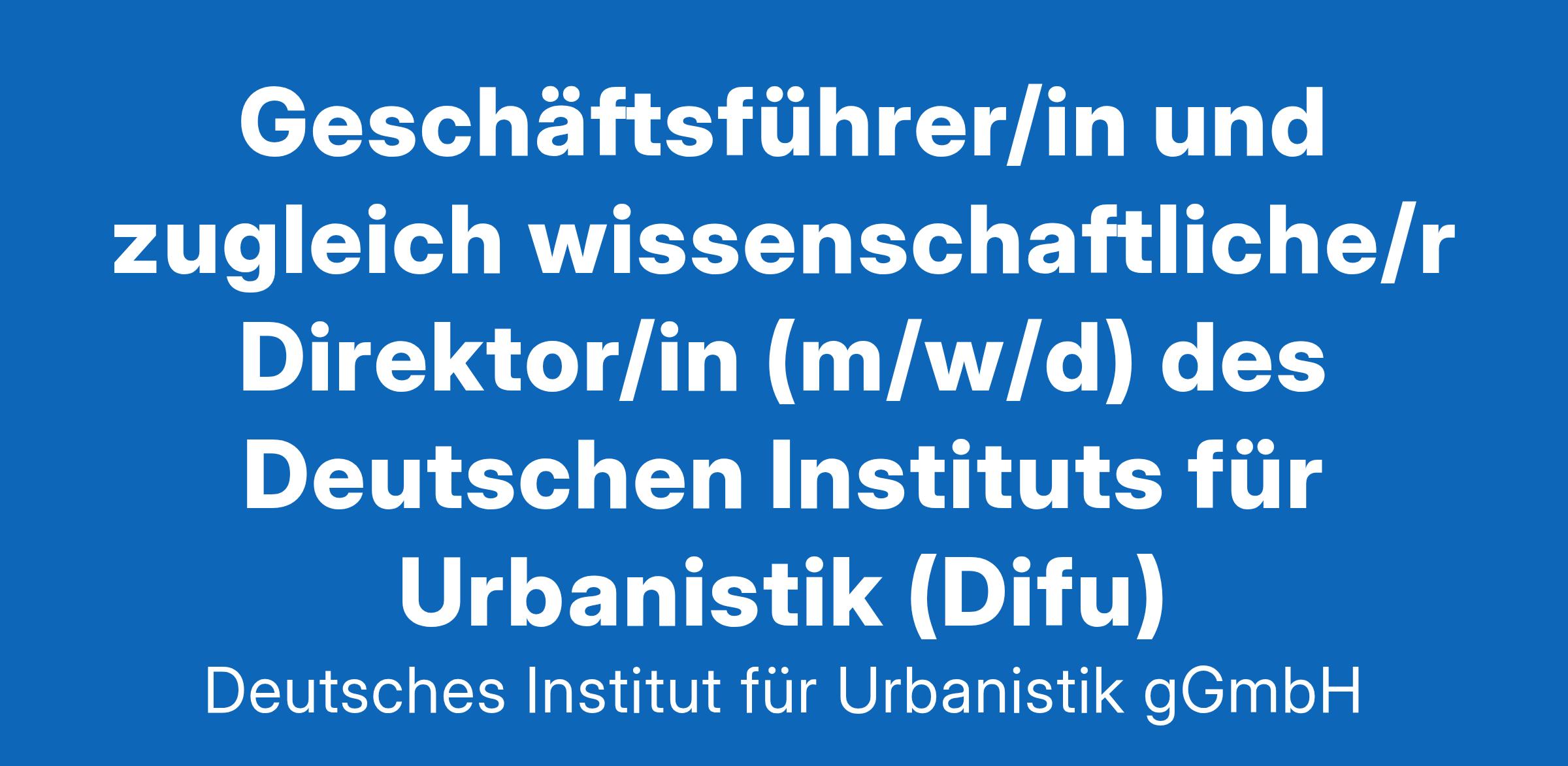 Ihre vollständigen Bewerbungsunterlagen richten Sie bitte in schriftlicher Form mit ausführlichen Unterlagen, die zur Beurteilung der Eignung, Befähigung und fachlichen Leistung Auskunft geben unter Nennung des Betreffs »Geschäftsführung Difu« bis spätestens zum 15.02.2025 an: