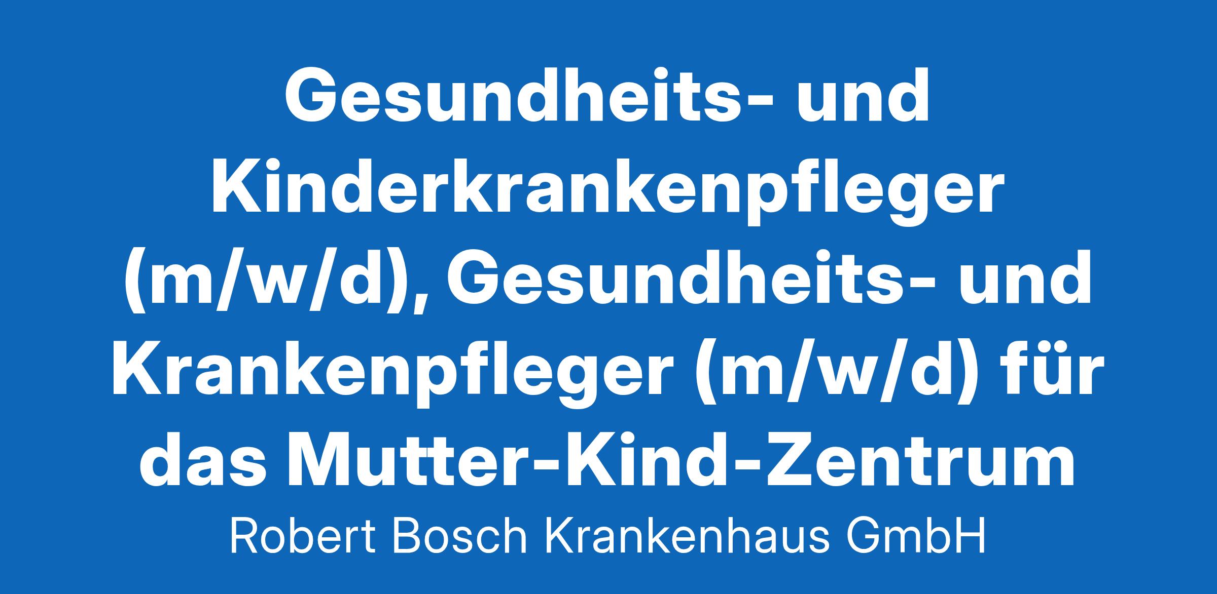 Beschäftigungsumfang: TeilzeitUnternehmensbeschreibungDas Robert-Bosch-Krankenhaus ist ein von der Robert Bosch Stiftung getragenes Krankenhaus der Zentralversorgung mit Funktionen der Maximalversorgung an drei Standorten. Mit 1.041 Betten nehmen das RBK, seine Standorte Klinik Charlottenhaus und RBK Lungenzentrum Stuttgart (Klinik Schillerhöhe) sowie die Klinik für Geriatrische Rehabilitation im Jahr bis zu 40.000 Patienten stationär auf. Zum Krankenhausbetrieb mit über 3.000 Mitarbeitenden gehören 17 Fachabteilungen in verschiedenen medizinischen Zentren, ein Bildungszentrum und Forschungsinstitute. Für Mitarbeitende bieten sich in dieser Struktur vielfältige Entwicklungsmöglichkeiten.StellenbeschreibungZugewandte Betreuung der Wöchnerinnen und Neugeborenen im Rooming-In-Konzept