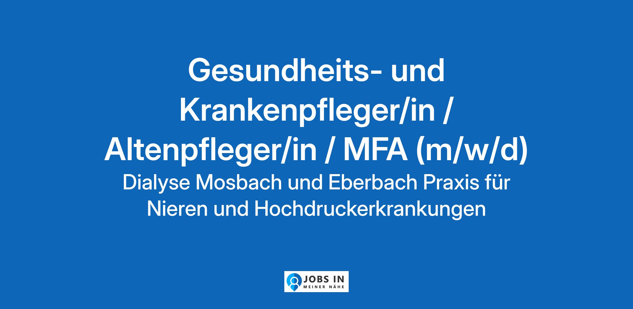 Wir sind ein Dialysezentrum mit Standorten in Mosbach sowie in Eberbach und führen neben der Nephrologischen Facharztpraxis auch eine Kardiologische Privatpraxis mit Lipidologischer Sprechstunde in unseren top ausgestatteten Räumlichkeiten im Ärztehaus der GRN-Klinik in Eberbach sowie in Mosbach ... Dialyse;Notfälle;Flexibilität;Engagement;Selbstmotivation;Patientenbetreuung;Überwachung;Hygienevorschriften;Handel;Ambulante Termine;Fürsorge-Standard;Sozialkompetent;Hämodialyse Original Stellenanzeige auf StepStone.de – Jetzt Jobagent bei StepStone einrichten und Traumjob finden! https://bit.ly/2KOagYD Mehr Informationen zu Arbeitgebern, Gehaltsdaten und Karrieretipps finden Sie auf StepStone.de
