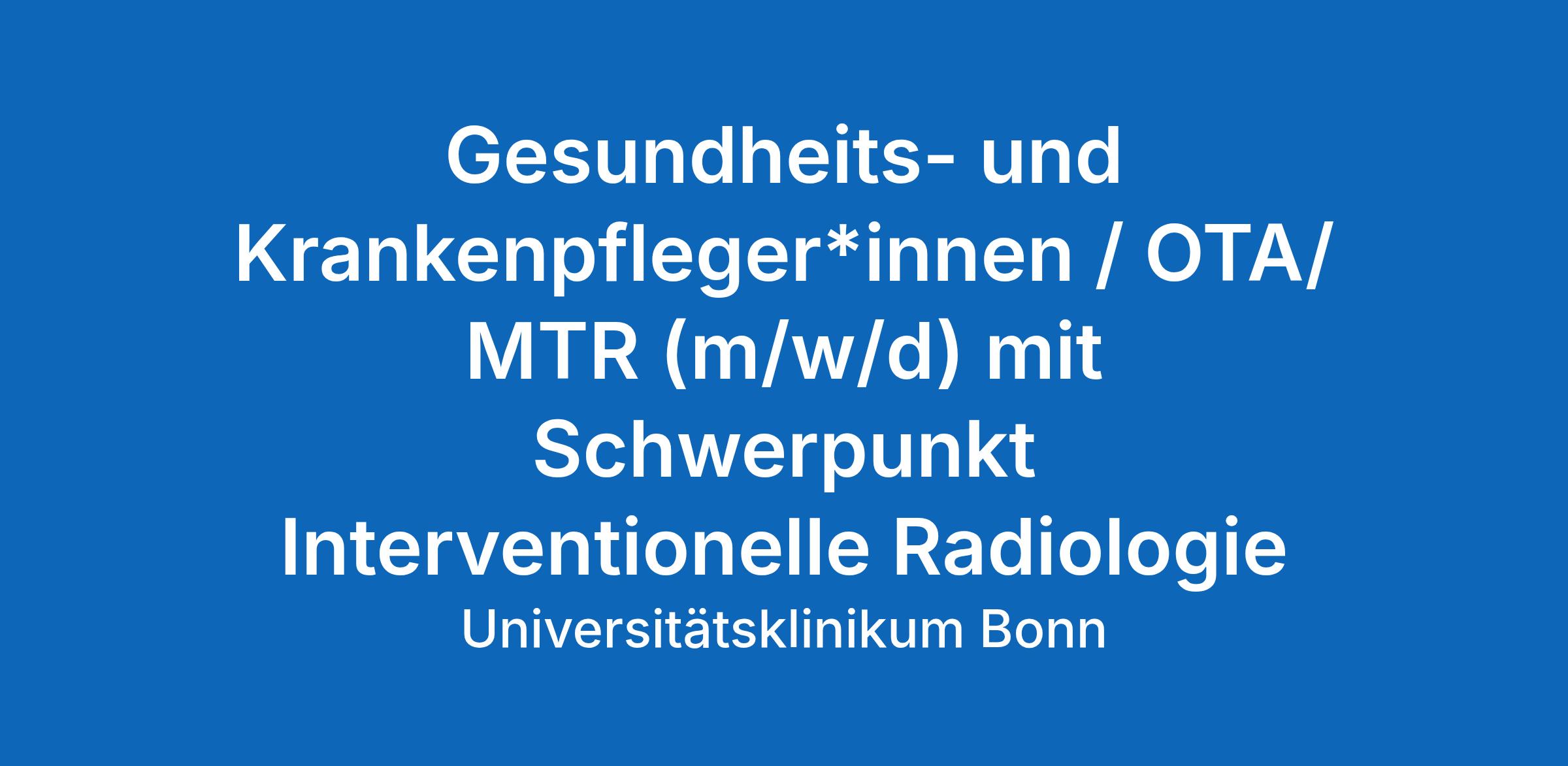 In der Klinik für Diagnostische und Interventionelle Radiologie des Universitätsklinikums Bonn ist zum nächstmöglichen Zeitpunkt folgende Stelle in Vollzeit (38,5 Std./Woche) / Teilzeit zu besetzen: