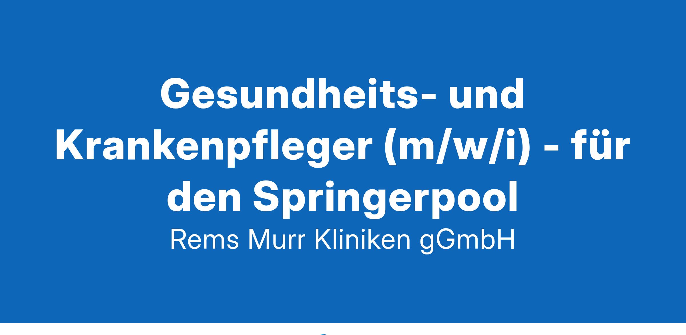 Vielseitig einpflegbar ?!Wir suchen zum nächstmöglichen Zeitpunkt in Voll- oder Teilzeit bzw. gern auch als Minijob für unsere Klinik in SchorndorfGesundheits- und Krankenpfleger (m/w/i) - für den Springerpoolzur flexiblen und kompetenten Unterstützung unserer Pflegefachkräfte auf verschiedenen StationenReferenznummer: S-1-280-19Im Rahmen unseres neu gegründeten Springerpools unterstützen Sie unsere Pflegefachkräfte in Schorndorf flexibel bei zusätzlichem personellen Bedarf und versorgen unsere Patienten in unterschiedlichen Fachbereichen. Ihr Einsatz erfolgt dabei nach einem festen zuverlässigen Dienstplan unter Berücksichtigung Ihrer Fachkenntnisse, Präferenzen und Verfügbarkeiten.