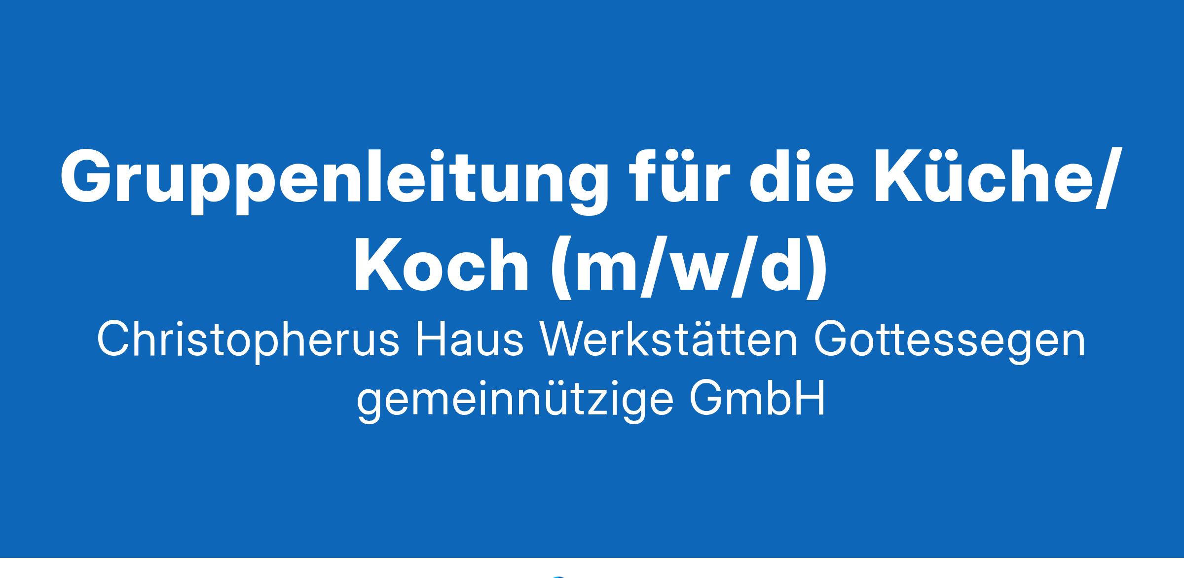in Vollzeit (39 h/Woche) Wir erwarten für die Aufgabe eine flexible teamfähige Persönlichkeit mit Ausbildung zum Koch/Köchin, psychische Stabilität mit einem hohen Maß an Leistungsbereitschaft und Verantwortungsbewusstsein. Zudem erfordert die Tätigkeit eine strukturierte und selbstständige Arbeitsweise. Grundlegende EDV- Kenntnisse, sowie Aufgeschlossenheit der anthroposophischen Grundlagen unserer Arbeit sollte vorhanden sein. Zu den Hauptaufgaben gehören: Freude im Umgang mit Menschen mit Assistenzbedarf und der Anleitung bei der individuellen Berufs- und Persönlichkeitsförderung Übernahme von notwendigen Assistenzleistungen im lebenspraktischen und pflegerischen Bereich Entwickeln und Erstellen von beruflichen und persönlichen Perspektiven, sowie deren Dokumentation fachpraktische und theoretische Unterweisungen Zusammenarbeit mit Eltern, Angehörigen und Betreuern Umsetzung unseres Berufsbildungskonzeptes und aktive Weitergestaltung Wir bieten: Vergütung nach TVÖD/VKA, je nach Qualifikation Zusätzliche Altersvorsorge (VBLU) Vergünstigtes Mittagessen Geregelte Arbeitszeiten (kein Schichtdienst, keine Wochenendarbeit) Einarbeitung durch Kollegen/innen und Mentorierung Kollegiales miteinander und flache hierarchische Strukturen regelmäßige Schulungen und Weiterbildungsmöglichkeiten Attraktive Mitarbeiterangebote wie z.B. Business Bike, Unternehmensfitness, Jobticket Grundsätzlich ist die ausgeschriebene Stelle mit einer zweijährigen Befristung versehen, wobei ein unbefristetes Beschäftigungsverhältnis angestrebt wird. Haben wir Ihr Interesse geweckt? Ihre schriftliche Bewerbung (bitte geben Sie an, ab wann sie verfügbar wären) richten Sie bitte an: andre.loeffler[AT]werkstaetten-gottessegen.de Werkstätten Gottessegen gGmbH