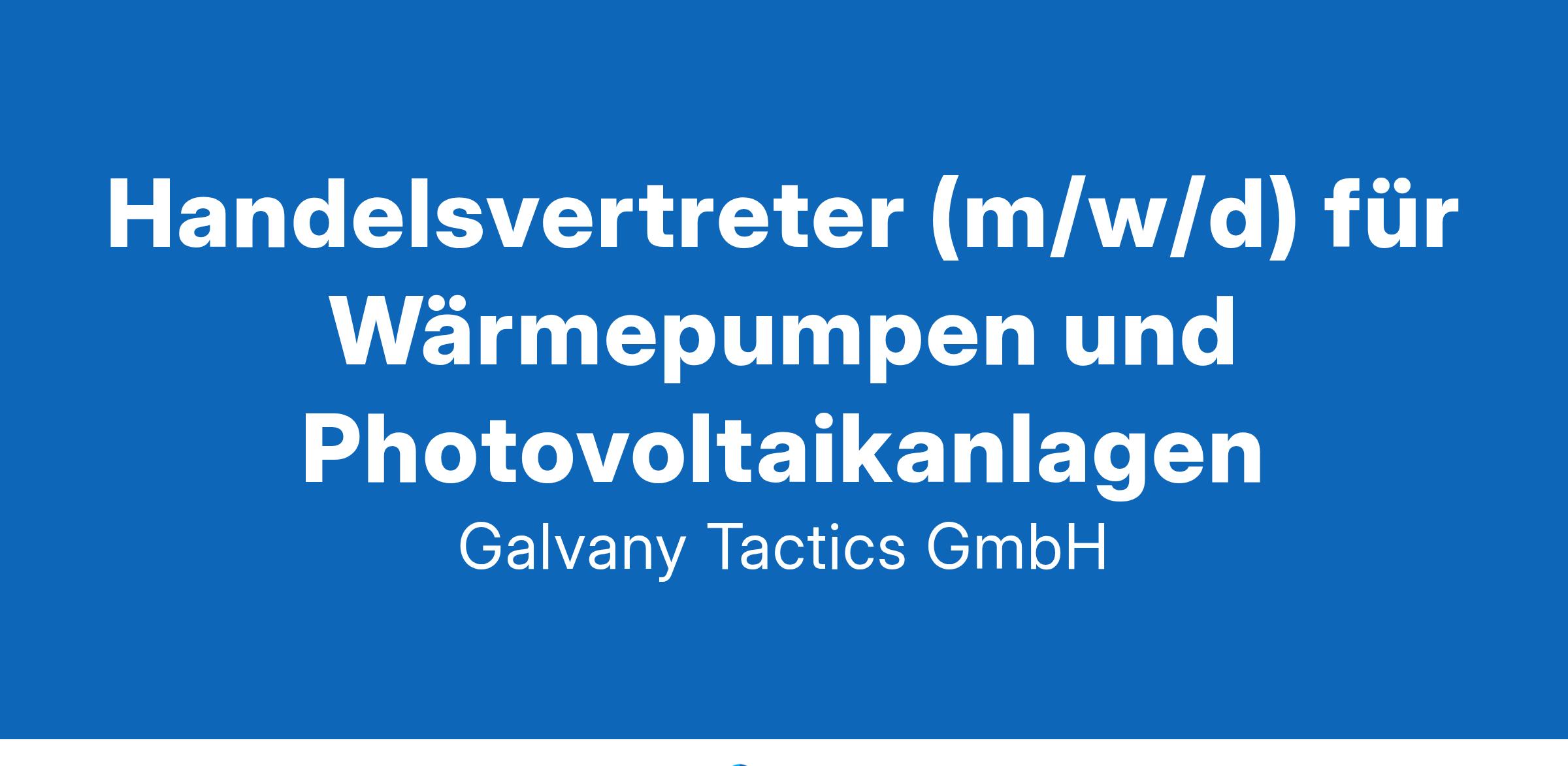 Die Galvany Tactics GmbH mit Sitz in Berlin ist ein überregional tätiges Unternehmen, das sich auf die Planung, den Vertrieb und die Installation von Photovoltaikanlagen und Wärmepumpen spezialisiert hat. Als offizieller Kooperationspartner von Panasonic bieten wir unseren Kunden Zugang zu modernster Technologie und erstklassigen Produkten im Bereich erneuerbare Energien. Unser Ziel ist es, Privatpersonen und Unternehmen deutschlandweit bei der Umstellung auf nachhaltige und energieeffiziente Lösungen zu unterstützen. Mit einem starken Fokus auf Qualität, individuelle Beratung und innovative Energiekonzepte setzen wir auf zukunftsweisende Technologien, um eine nachhaltige Energieversorgung zu gewährleisten und aktiv zur Energiewende beizutragen. Handelsvertreter (m/w/d) für Wärmepumpen und Photovoltaikanlagen Ihre Chance auf Erfolg in einem zukunftssicheren Markt!