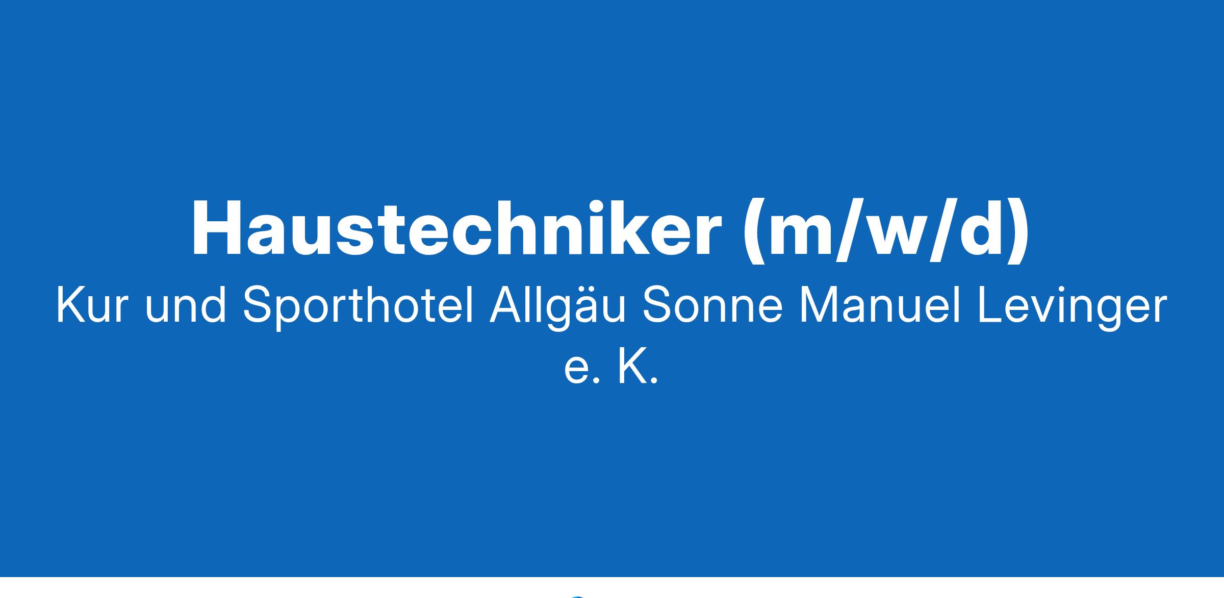 Haustechniker (m/w/d) 5-Sterne Sport- & Wellnesshotel In familiärer Atmosphäre erwartet Sie ein anspruchsvolles und abwechslungsreiches Aufgabengebiet im 5-Sterne-Hotel. Mit ihren 149 Zimmern, Wellnesswelt sowie Panorama-Fitnesswelt bietet die Allgäu Sonne ihren Mitarbeitenden ein interessantes und angenehmes Arbeitsumfeld. Wir sind Partner der Fair Job Hotels. Das erwartet Sie unter anderem an Ihrem Arbeitsplatz in der Allgäu Sonne Inhabergeführtes 5-Sterne-Hotel mit familiärer, herzlicher Atmosphäre Individuelle Arbeitszeitmodelle abgestimmt auf Ihre persönlichen Bedürfnisse Saisonunabhängiger Arbeitsplatz Nutzung des Innenpools Training in der Fitnesswelt Bei Bedarf ein Zimmer im Personalhaus mit Bergpanoramablick und WLAN 50 % Rabatt für den Urlaub mit der Familie in 80 Allgäu Top Hotels Reduzierte Raten bei den Fair Job Hotels Hoher Freizeitwert in einer der schönsten (Ferien-)Regionen Deutschlands Damit unterstützen Sie unser Team Ausführung aller technischen und handwerklichen Arbeiten im Außen- und Innenbereich des Hotels Abarbeiten von hausinternen Reparaturaufträgen Überwachung der technischen Anlagen wie Pools, Sauna Enge Zusammenarbeit mit dem Housekeeping und der Rezeption Das bringen Sie mit Führerschein Klasse B Handwerkliches Geschick Belastbarkeit, körperliche Fitness Zuverlässigkeit Eigeninitiative und selbstständige Arbeitsweise Gute Deutschkenntnisse Sie möchten gerne in einer der schönsten Ferienregionen Deutschlands arbeiten? Dann freuen wir uns auf Ihre Bewerbung! Für Vorabinformationen stehen wir Ihnen gerne auch telefonisch zur Verfügung. Wir freuen uns auf Ihre Bewerbung: Manuel Levinger e.K.