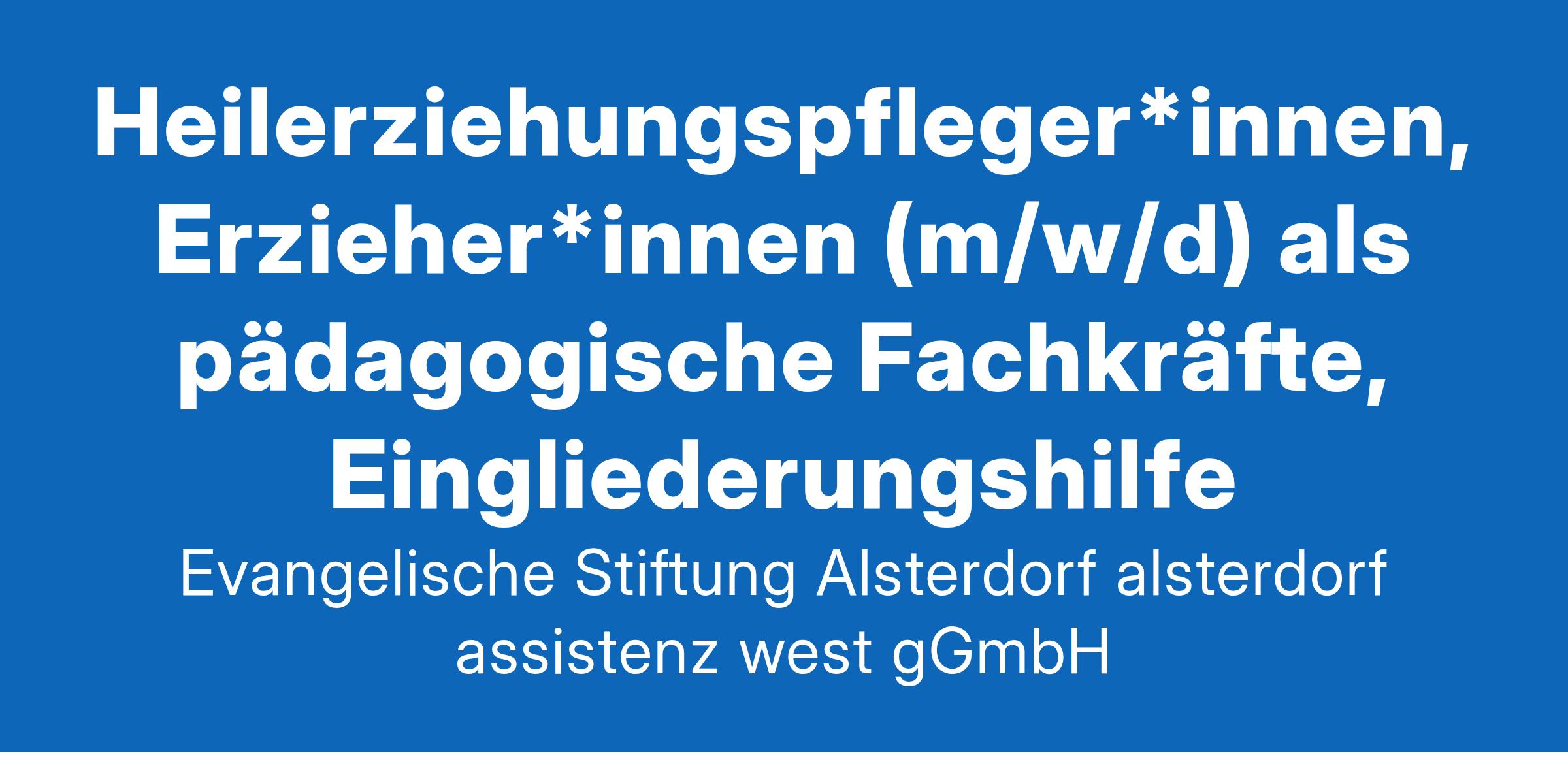 Willkommen in der Evangelischen Stiftung Alsterdorf. Als diakonisches Dienstleistungsunternehmen in Norddeutschland mit rund 6.500 Mitarbeitenden sind wir schwerpunktmäßig in den Bereichen Eingliederungshilfe, Bildung und Medizin tätig. Das Leben ist anders. Wir auch. Auf zu neuen Horizonten! Als Teil der Stiftung bieten wir Dienstleistungen für Menschen mit Assistenzbedarf und suchen laufend qualifiziertes Fachpersonal. Lust auf neue Herausforderungen, persönliche Entwicklung und beste Karrierechancen? Dann gleich bewerben! Für mehrere Standorte im Hamburger Westen und Süden sucht die alsterdorf assistenz west gGmbH ab sofort Heilerziehungspfleger *innen, Erzieher *innen