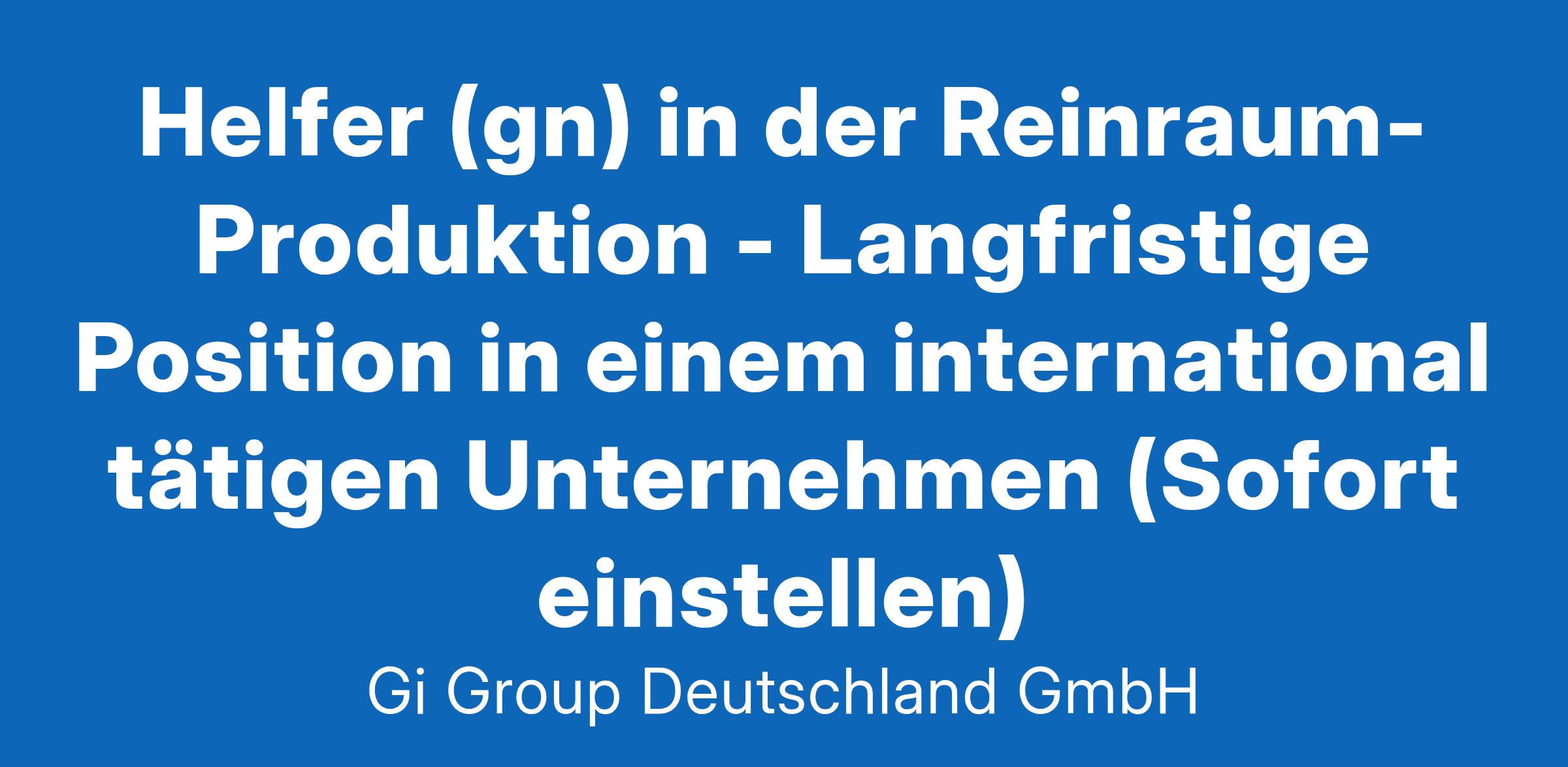 Helfer (gn) in der Reinraum-Produktion ab sofort in Vollzeit in Waldbronn Die Gi Group ist ein international agierender Personaldienstleister mit mehr als 500 Standorten in 40 Ländern. Unser Angebot Attraktive Vergütung ab 15,23 €/Std.steigend mit Betriebszugehörigkeit Einen langfristigen Einsatz in einem unserer top Kundenunternehmen Gute Erreichbarkeit mit dem PKW und nahegelegene Parkplätze vorhanden Entwicklungsmöglichkeiten mit dem Netzwerk eines internationalen Unternehmens Dein Profil als Helfer Erste Arbeitserfahrung in Produktionsumgebungen und Reinraum (wünschenswert) Bereitschaft in Wechselschicht (Früh- oder Spätschicht) zu arbeiten Gute Deutschkenntnisse mind. B Level in Wort und Schrift Fingerfertigkeit, Nichtraucher und kein Make-up Deine Aufgaben Herstellung von Screen Tapes Regelmäßige Qualitätskontrollen und einfache Fehlerbehebungen Kontinuierliche Reinigung und Inspektion des Produktions-Equipments Überwachung und Sicherstellung des Materialflusses Deine Bewerbung Für Deine Bewerbung als Helfer klicke bitte einfach auf „Jetzt bewerben“. Dort kannst Du Deine Kontaktdaten eingeben sowie Deinen Lebenslauf und Deine Bewerbungsunterlagen hochladen. Du benötigst dafür nur ca. 1 Minute. Dein zuständiger Personaldisponent wird sich bei Dir schnellstmöglich melden. Gerne kannst Du uns auch Deine Bewerbungsunterlagen per E-Mail zusenden. Wir freuen uns auf Deine Bewerbung! Unsere Stellenangebote richten sich an Arbeitssuchende jeglichen Geschlechts. (gn) = geschlechtsneutral. Kontakt Gi Group Recruiting Team