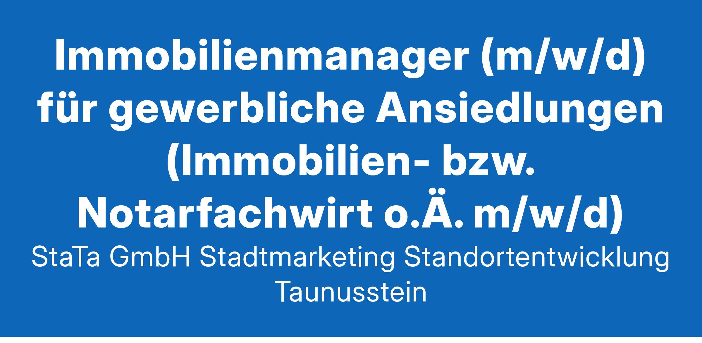 Die StaTa GmbH Stadtmarketing & Standortentwicklung Taunusstein ist ein in privatrechtlicher Rechtsform organisiertes 100%iges Tochterunternehmen der Stadt Taunusstein und zeichnet sich einerseits für die Standortförderung sowie andererseits für das Ansiedlungsmanagement verantwortlich. Zur Erreichung unserer Ziele suchen wir zum nächstmöglichen Zeitpunkt einen Immobilienmanager (m/w/d) für gewerbliche Ansiedlungen Ihre Aufgaben Zu Ihren Aufgaben zählen dabei u.a.: Ankauf und Verkauf von Gewerbeflächen und Immobilien Verwaltung von Gewerbe – und Bestandsimmobilien Im Ansiedlungsmanagement Flächenentwicklungskonzepte für zukünftige Gewerbetreibende entwickeln Verhandlung und Abwicklung von Verkauf-, Tausch-, Erbbaurechtsverträgen und Übertragungen Berechnung der An- und Verkaufspreise Neuansiedlungsakquisition und Interessentenberatung für Gewerbetreibende Verhandlung von Dienstbarkeit, Rechten und Baulasten die operative Mitarbeit im Tagesgeschäft eine professionelle und verantwortungsvolle Zusammenarbeit mit einer vielfältigen Stakeholder-Struktur (Bürger/-innen, Wirtschaftsakteure, Verwaltung, Politik, Presse etc.) Kooperation mit Immobilienwirtschaft und Investoren Ihr Profil Sie sollten über nachfolgende persönliche Eigenschaften und Qualifikationen verfügen: eine Weiterbildung zum Immobilien- oder Notarfachwirt (m/w/d) sowie nachgewiesene mehrjährige und fundierte Erfahrung innerhalb des o. g. Aufgabenspektrums – idealerweise im Bereich Immobilienwirtschaft oder ein passendes Studium ein sicheres, interessengerechtes und integratives Auftreten im Spannungsfeld vielschichtiger Interessenlagen – idealerweise durch nachgewiesene Berufserfahrung Fachkenntnisse im Bereich des Vertragswesens im Immobilien- und Sachenrecht liegen vor Berufserfahrung im An- und Verkauf von Grundstücken die Fähigkeit, auch in Drucksituationen stets professionell, verantwortungsvoll, strukturiert und empathisch zu handeln sowie komplexe Sachverhalte sicher und mit Weitsicht zu entscheiden ein stark überdurchschnittlich ausgeprägtes Verhandlungs- und Kommunikationstalent die Wahrnehmung von Abendterminen stellt für Sie kein Problem dar sehr gute Deutschkenntnisse in Wort und Schrift setzen wir voraus eine hohe Begeisterung und das Gespür für aktuelle Entwicklungen in den o. g. Aufgabenbereichen ein hohes Selbstverständnis für die zwingende Notwendigkeit von Innovation sowie stetiger Optimierung Was wir bieten ein abwechslungsreiches und vielschichtiges Aufgabenfeld an der Schnittstelle von Wirtschaft, Politik und Verwaltung mit stetig wachsendem Geschäfts- und Verantwortungsbereich flache Hierarchien mit kurzen, direkten und vertrauensvollen Entscheidungswegen persönliche Einarbeitung und Onboarding ins Team ein überdurchschnittlich hohes Maß an Eigenverantwortlichkeit eine moderne und weitläufige Arbeitsumgebung mit Pkw-Stellplatz und der Möglichkeit zum mobilen Arbeiten eine aufgaben-, qualifikations- und verantwortungsangemessene Vergütung Finden Sie sich in den voranstehenden Aufgaben und dem Profil wieder? Dann freuen wir uns auf Ihre aussagekräftige Online-Bewerbung nebst Angabe Ihrer Gehaltsvorstellungen bis zum 9. Februar 2025. Fragen beantworten Ihnen gerne Herr Albrecht unter Tel. 06128/9371105 oder per Mail: