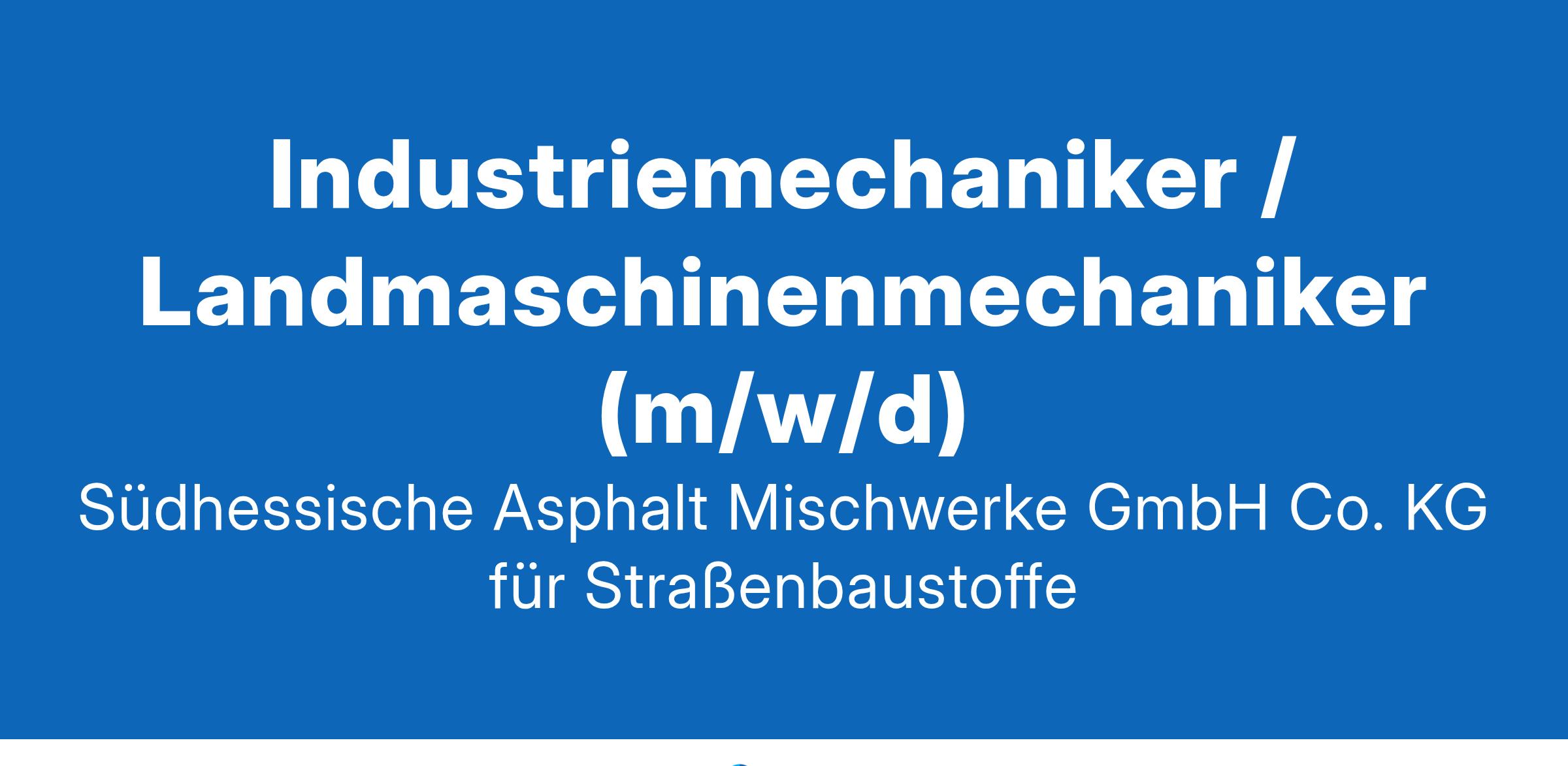 Für unsere Beteiligungsgesellschaft Südhessische Asphalt-Mischwerke GmbH & Co. KG für Straßenbaustoffe suchen wir ab sofort für unseren Standort Aschaffenburg einen Industriemechaniker / Landmaschinenmechaniker (m/w/d) in Vollzeit. Bist du dabei? Industriemechaniker / Landmaschinenmechaniker (m/w/d) Südhessische Asphalt-Mischwerke GmbH & Co. KG für Straßenbaustoffe | Asphaltmischanlage Aschaffenburg | Start ab sofort | Vollzeit | Kennziffer: 11800