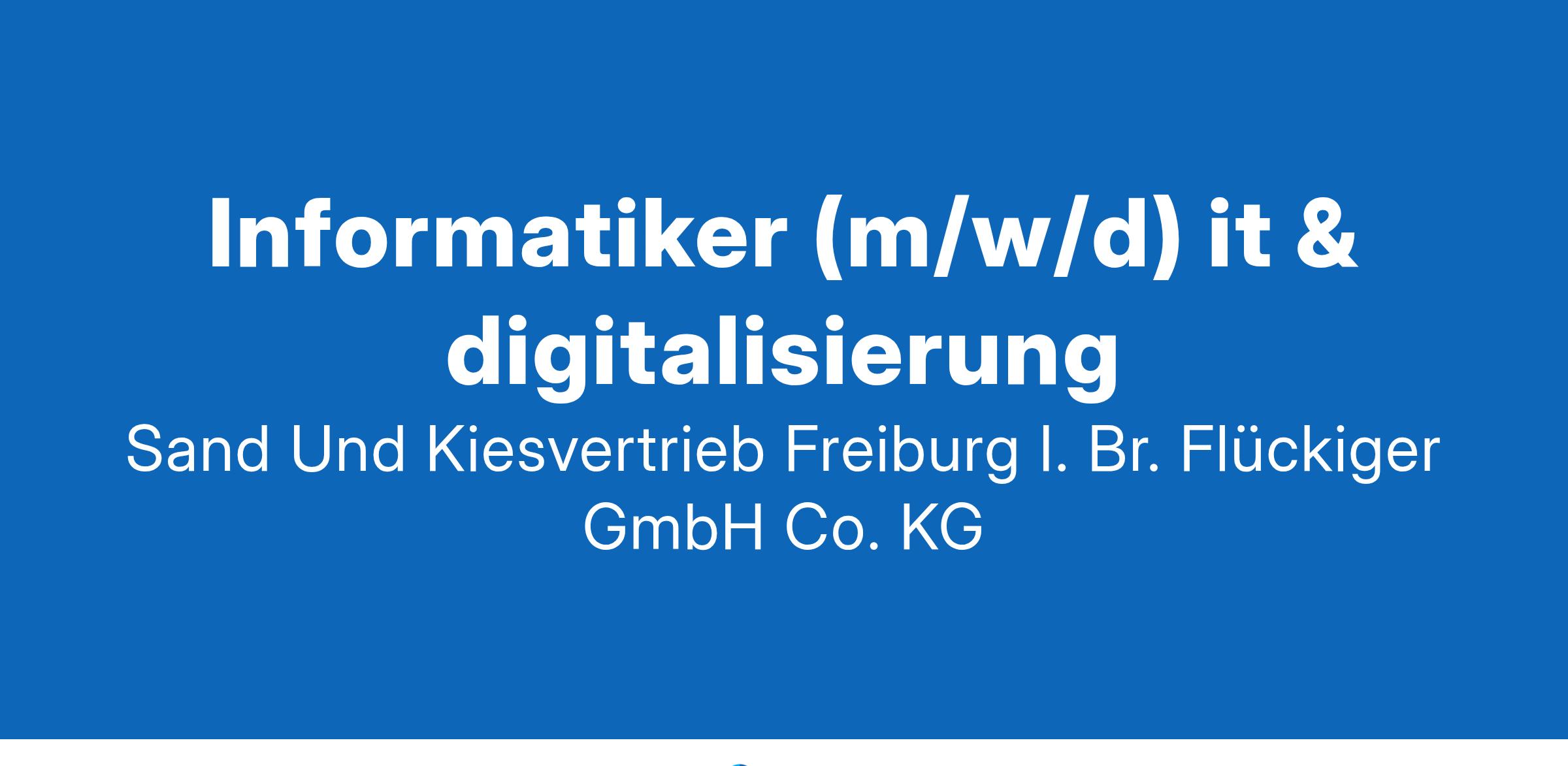 Sand- und Kiesvertrieb Freiburg i. Br. Flückiger Gmb H & Co. KG -- Informatiker (m/w/d) IT & DigitalisierungDie Firmengruppe Flückiger steht für ein inhabergeführtes Familienunternehmen mit Sitz in Freiburg im Breisgau. Wissen, Erfahrung und Kompetenz unserer Mitarbeiter/-innen sind seit Jahrzehnten unsere wichtigste Ressource bei der Produktion von Sand- und Kies, Transportbeton sowie der Herstellung von Recyclingbaustoffen an unseren Standorten in Südbaden und im Großraum Basel.Um dieser Tradition weiterhin treu zu bleiben, suchen wir zur Verstärkung in unserer Verwaltung in *Freiburg* zum nächstmöglichen Zeitpunkt einenInformatiker (m/w/d) IT & DigitalisierungTeam AufgabenSicherstellen des laufenden Betriebs im Büro und der ProduktionUnterstützung unserer AnwenderOptimieren unserer Software-Lösungen und AbläufeEntwickeln, testen, konfigurieren und installieren von Software-LösungenKoordination unserer externen und internen Dienstleister