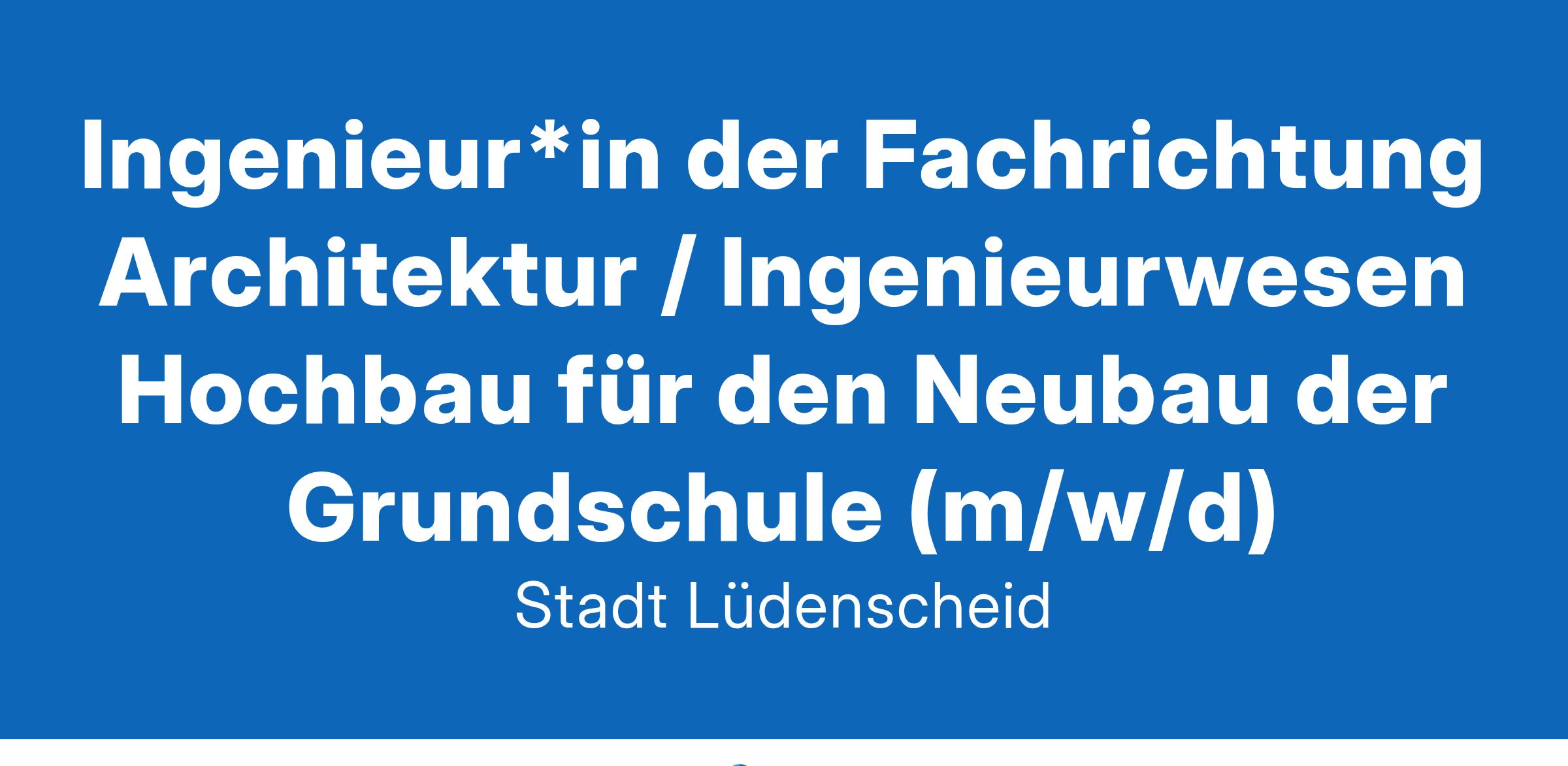 Die Stadt Lüdenscheid (ca. 74.000 Einwohner*innen) - Kreisstadt im Märkischen Kreis - sucht zum nächstmöglichen Zeitpunkt für die Zentrale GebäudeWirtschaft (ZGW) eine*n Ingenieur*in der Fachrichtung Architektur / Ingenieurwesen Hochbau für den Neubau der Grundschule Lösenbach