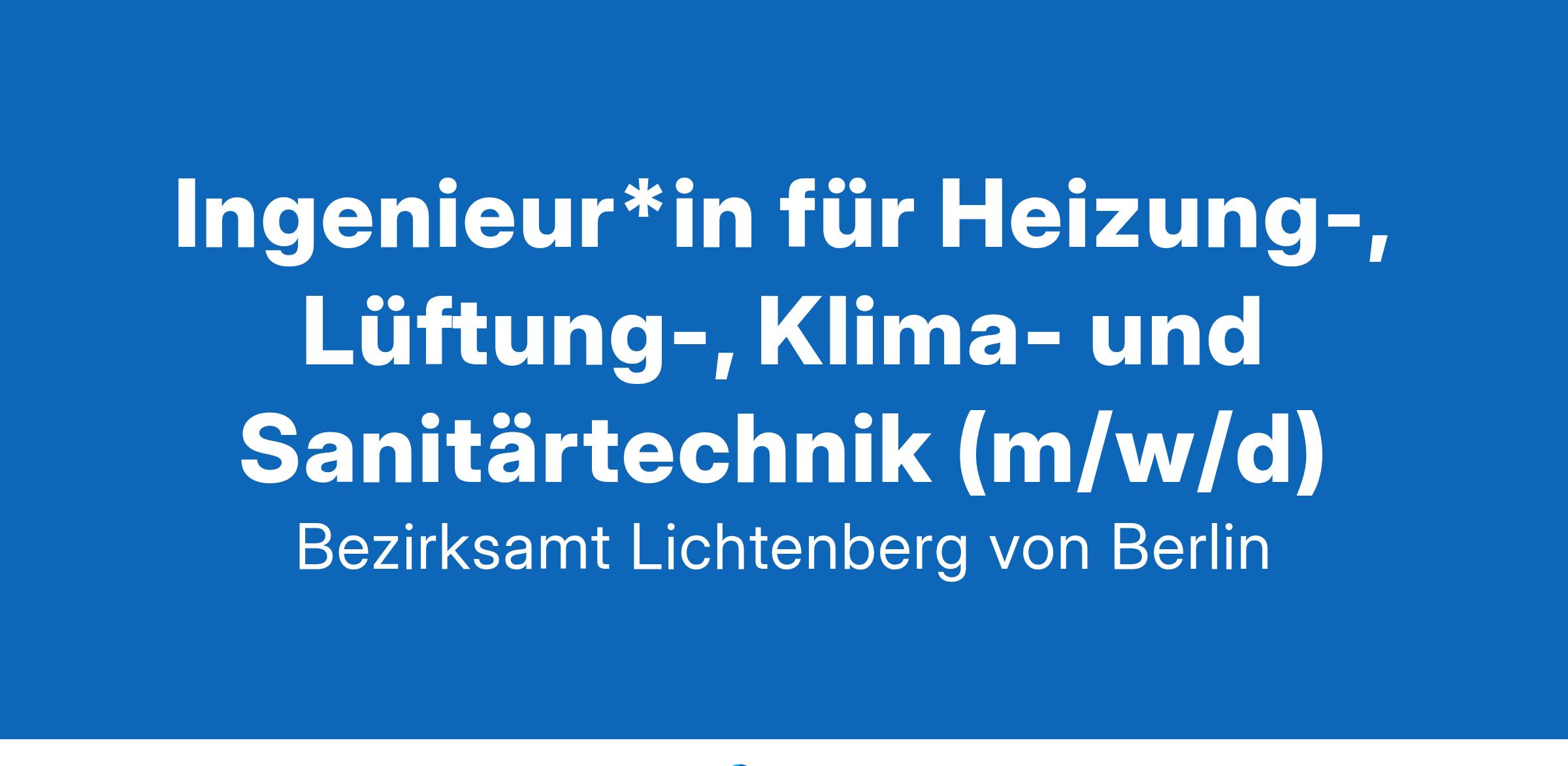 Das Bezirksamt Lichtenberg von Berlin, Serviceeinheit Facility Management sucht zur Kennziffer: 3306/42801/154 ab sofort, unbefristet, eine*n engagierte*nIngenieur*in für Heizung-, Lüftung-, Klima- und Sanitärtechnik (m/w/d)Entgeltgruppe: E11 Fgr. 1 Teil II Abschnitt 22.1 der Anlage A zum TV-L