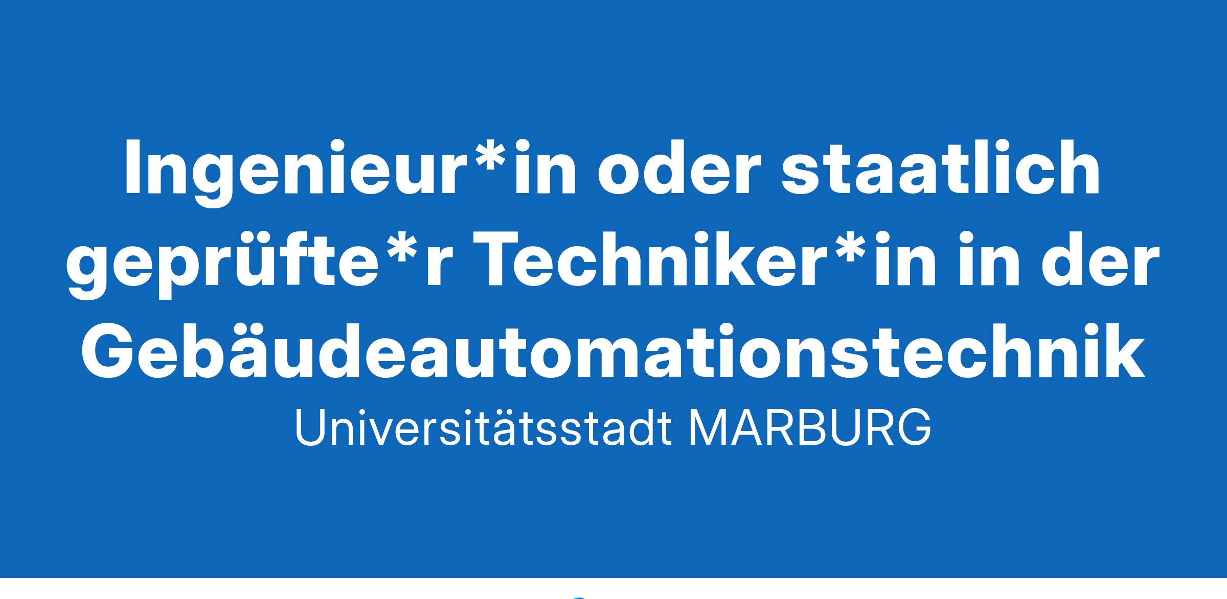 Wir, die Universitätsstadt Marburg , suchen Sie zum nächstmöglichen Zeitpunkt für unseren Fachdienst 65 - Hochbau - als Ingenieur*in oder staatlich geprüfte*n Techniker*in in der Gebäudeautomationstechnik zur Besetzung einer unbefristeten Vollzeitstelle.