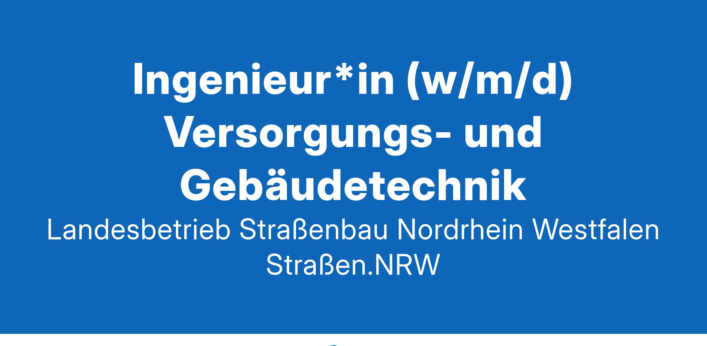 Der Landesbetrieb Straßenbau Nordrhein-Westfalen (Straßen.NRW) sucht zum nächstmöglichen Zeitpunkt für die Landesverkehrszentrale, mit dem Dienstort Bochum, Köln, Krefeld oder Leverkusen eine/n Ingenieur*in (w/m/d) Versorgungs- und Gebäudetechnik.