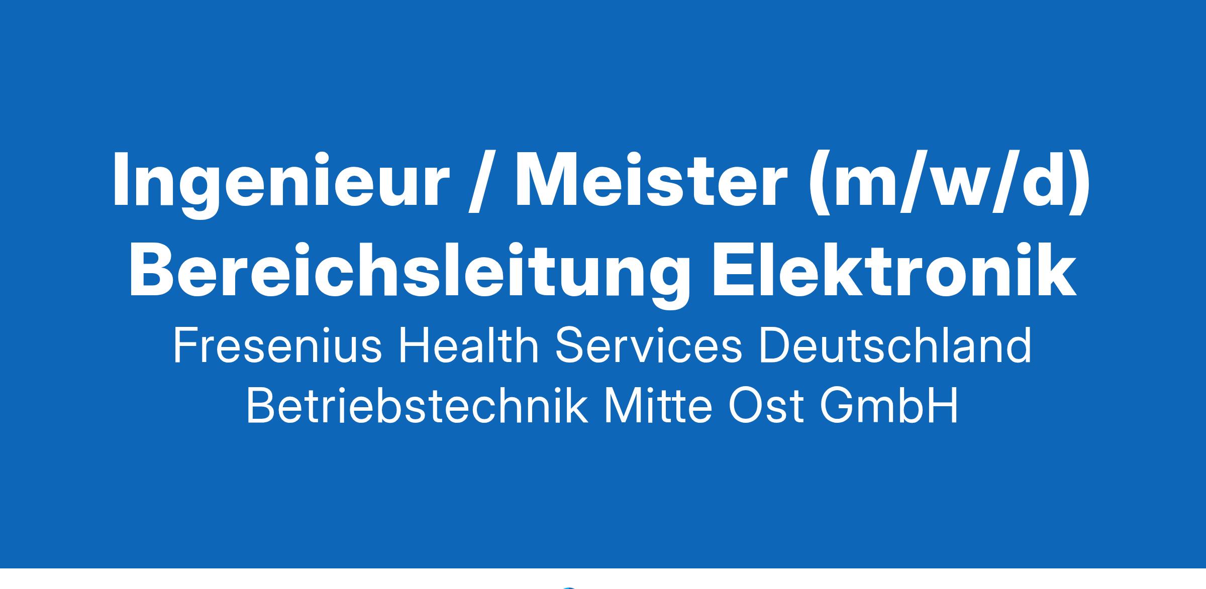 Fresenius Karriere Ingenieur / Meister (m/w/d) Bereichsleitung Elektronik Wir suchen Sie an unserem Standort Erfurt zum nächstmöglichen Zeitpunkt in Vollzeit einen Ingenieur / Meister (m/w/d) Bereichsleitung Elektronik. Fresenius Health Services bietet umfassende Dienstleistungen und Beratungen rund um die technische Infrastruktur von Gesundheitseinrichtungen. Dazu gehören Medizintechnik, Betriebstechnik, Sterilgutversorgung und ebenso die Digitalisierung von Prozessen. Gemeinsam mit unseren Kund:innen erarbeiten wir zukunftsfähige Konzepte für einen effizienten und bedarfsgerechten technischen Betrieb und stellen diesen auch langfristig sicher. Unsere rund 3.000 Kolleg:innen leben eine Kultur der Offenheit und Wertschätzung. Wir freuen uns immer über neue Kolleg:innen, die mit ihren unterschiedlichen Erfahrungen und Kompetenzen unser Team bereichern. Bei uns treffen gute Ideen immer auf offene Ohren. Wir bieten tolle Entwicklungsmöglichkeiten und Aufstiegschancen. Als Arbeitgeber mit Zukunftsmission nutzen wir individuelle und flexible Arbeitsplatzlösungen. Volle Fahrt Richtung Zukunft! Entdecken Sie Ihre Karriere bei Fresenius Health Services, wir freuen uns auf Sie. Erfurt Vollzeit Kennziffer: 1521 Ihre Benefits: Freundliches und teamorientiertes Betriebsklima und Mitarbeitenden-Events Feste Ansprechperson bei der Einarbeitung und erfahrene Kolleg:innen Individuelle Fort- und Weiterbildungsmöglichkeiten über unsere Akademie Mitwirkungs- und Gestaltungsspielraum Sicherer Arbeitsplatz im Bereich des Gesundheitswesens Zuschuss zur betrieblichen Altersvorsorge Jobrad und Team-Staffel Corporate Benefits sowie Rabatte für Fitnessstudios Ihre Aufgaben: Organisation und Leitung des Fachbereiches Elektrotechnik für das Helios Klinikum Erfurt und angeschlossene Standorte Organisation, Instandhaltung und Störungsbeseitigung an den elektrotechnischen Anlagen des Klinikums Anleitung und Führung der Mitarbeiter des verantwortlichen Bereiches Eigenständige Projektabwicklung im Rahmen von Bau / Technikprojekten Organisation, Einweisung und Überwachung von Fremdfirmen und -Leistungen Beratung der Standortleitung Technik in allen Fragen im Bereich Elektrotechnik Zusammenarbeit mit den Klinikabteilungen im Sinne ausgewogener Dienstleistungserbringung Einhaltung von gesetzlichen und vertraglichen Bestimmungen im Verantwortungsbereich Optimierung der Anlagentechnik Betreuung der Auszubildenden Das bringen Sie mit: Erfolgreich abgeschlossene Ausbildung zum Ingenieur, Meister oder Techniker (m/w/d) im Bereich Elektrotechnik, elektrische Gebäudeausrüstung oder vergleichbar Kenntnisse und Erfahrungen in der Planung gewünscht, nicht Bedingung Erfahrung in Instandhaltungs- und Wartungsorganisation elektr. Anlagen Interesse an der Entwicklung und Realisierung von Projekten im Aufgabenbereich Umgang mit Revisions- und Installationsplänen, Fertigkeiten im Bereich CAFM von Vorteil Sicherer Umgang mit den MS-Office-Anwendungen sowie digitalisierten Dokumentations- und Revisionsunterlagen Gute EDV-Kenntnisse und Bereitschaft zur Anwendung arbeitsunterstützender EDV-Systeme Hohes Maß an Team- und Kommunikationsfähigkeit sowie Erfahrung in Mitarbeiterführung Führerschein Klasse B Verantwortungsbewusstsein, Lernbereitschaft, Engagement, Belastbarkeit gehören zu Ihren Stärken Das ist Ihr Job? Dann freuen wir uns darauf, Sie kennenzulernen! Senden Sie uns gern Ihre Bewerbungsunterlagen mit Angabe Ihrer Gehaltsvorstellung und Ihrem frühestmöglichen Starttermin. Ihre Ansprechperson: Herr Rüdiger Barth Clusterleitung BT Tel.: +49 172 7953 825 Fresenius Health Services GmbH Am Bahnhof Westend 9-11 | 14059 Berlin