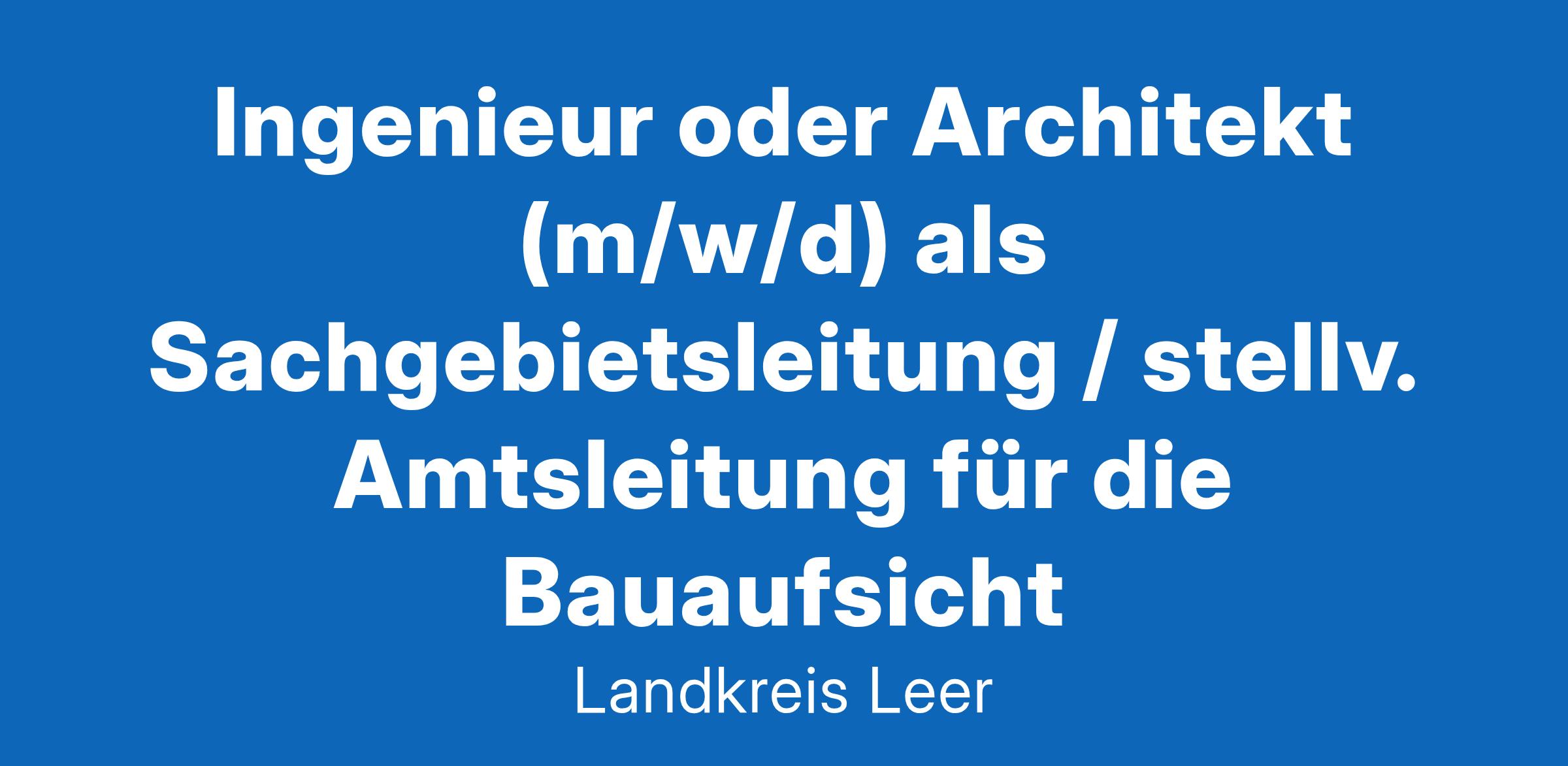 im Bauamt zu besetzen. Die Stelle ist nicht teilzeitgeeignet. Das Aufgabengebiet umfasst im Wesentlichen: die Leitung und Dienstaufsicht im Sachgebiet Bauaufsicht die Steuerung und Koordination des Dienstbetriebes in fachlicher, organisatorischer und personeller Hinsicht im Sachgebiet die Beratung der Mitarbeitenden des Sachgebietes in Fragen der rechtlichen Auslegung und Anwendung von Baubestimmungen die Erarbeitung von internen Dienstanweisungen für einen einheitlichen Verwaltungsvollzug die Mitwirkung bei der Bearbeitung von Angelegenheiten des Sachgebietes von grundsätzlicher Bedeutung die Bearbeitung und Genehmigung von Bauanträgen die bauordnungsrechtliche Prüfung, Überwachung und Abnahme genehmigungspflichtiger baulicher Anlagen die Beratung der Bauherren Voraussetzung für die Stellenbesetzung ist: ein mit Diplom oder Bachelorgrad erfolgreich abgeschlossenes Hochschulstudium im Studiengang Bauingenieurwesen - Schwerpunkt Hochbau - oder Architektur oder Wirtschaftsingenieurwesen mit der Fachrichtung Bauwirtschaft, Bau, Bauwesen oder Bauingenieurwesen mehrjährige Berufserfahrung in der Sachbearbeitung in der Bauaufsicht die Teilnahme an einer modularen Führungsfortbildung bzw. die Bereitschaft zur Teilnahme Darüber hinaus erwarten wir: Teamfähigkeit, einen kooperativen und motivierenden Führungsstil, Einfühlungsvermögen und Konfliktfähigkeit fundierte praxisorientierte Kenntnisse des öffentlichen Baurechts ein hohes Maß an Verantwortungsbewusstsein und Einsatzbereitschaft die Fähigkeit, lösungsorientiert, effektiv und eigenverantwortlich zu arbeiten ein sicheres Auftreten und Durchsetzungsvermögen eine gute Kommunikations- und Kooperationsbereitschaft Führerschein der Klasse B und die Bereitschaft zum Führen von Dienstfahrzeugen Wir bieten: ein Entgelt nach Entgeltgruppe 12 TVöD tarifliche Jahressonderzahlung, jährliches Leistungsentgelt und betriebliche Altersvorsorge eine vielfältige und verantwortungsvolle Tätigkeit in einem aufgeschlossenen Team gute Vereinbarkeit von Familie und Beruf durch flexible Arbeitszeitgestaltung sowie die Möglichkeit zur mobilen Arbeit bzw. Arbeit im Homeoffice Einarbeitung nach einem strukturierten Einarbeitungskonzept Unterstützung bei der Fort- und Weiterbildung ein nachhaltiges betriebliches Gesundheitsmanagement mit Hansefit, Fahrradleasing (JobRad) und diversen Betriebssportangeboten betriebliche Kinderbetreuungsangebote, wie z.B. die Großtagespflege „Regenbogen“ in Leer und Ferienbetreuungsprogramme Auszeichnung mit dem Qualitätssiegel der Bertelsmann Stiftung als „Familienfreundlicher Arbeitgeber“ Darüber hinaus bietet der Landkreis Leer (rund 175.000 Einwohnende) die Möglichkeit, in einer reizvollen Landschaft mit einem reichhaltigen Angebot an Sport-, Kultur- und Freizeiteinrichtungen zu leben und zu arbeiten. Durch seine Nähe zur Nordsee besitzt er einen hohen Freizeitwert. In der Kreisstadt Leer als kulturellem Mittelpunkt des Landkreises finden Sie inmitten der Altstadt mit ihren kunstvoll renovierten Häusern und Fassaden den touristischen Freizeithafen. Für eventuelle fachliche Rückfragen steht Ihnen im Bauamt die Amtsleiterin Frau Angela Büter (Tel. 0491/926-1264) sowie für Fragen zum Ablauf des Verfahrens im Hauptamt Frau Kerstin Bainton (Tel. 0491/926-1642) gerne zur Verfügung. Haben wir Ihr Interesse geweckt? Dann bewerben Sie sich jetzt noch bis zum 16.02.2024 ausschließlich online über unser Bewerberportal. Bitte beachten Sie, dass die Vorstellungsgespräche in KW 09 stattfinden.