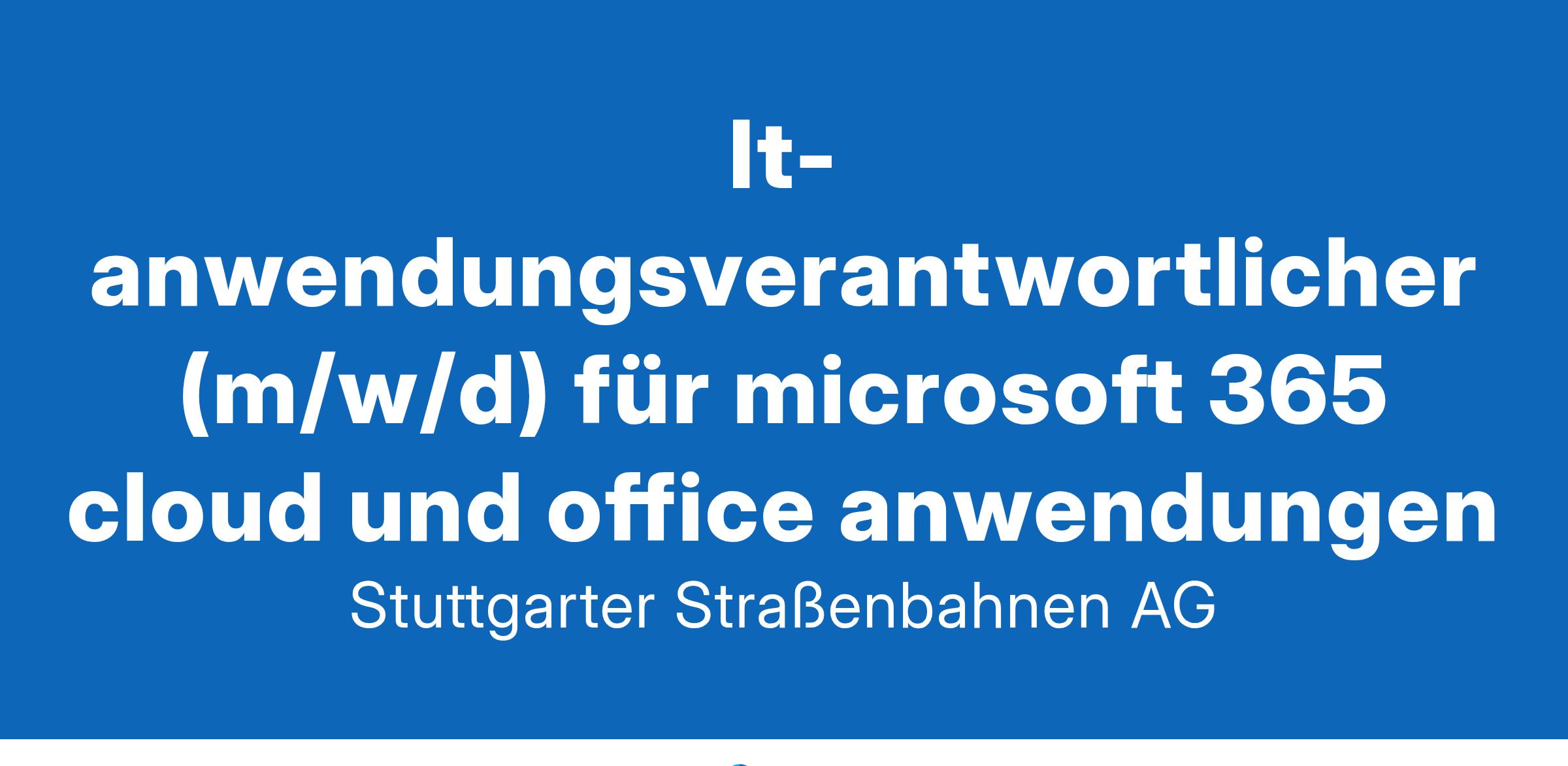 IT-Anwendungsverantwortlicher (m/w/d) für Microsoft 365 Cloud und Office Anwendungen - Stuttgarter Straßenbahnen AG IT-Anwendungsverantwortlicher (m/w/d) für Microsoft 365 Cloud und Office Anwendungen SSB steht für Nahverkehr, der ganz Stuttgart und die Region bewegt. Unsere über 3.700 Mitarbeitenden bringen täglich mehr als 600.000 Fahrgäste schnell, günstig, komfortabel und nachhaltig an ihr Ziel. Das ist unser Anspruch, aber natürlich haben wir auch noch viel vor – deshalb suchen wir dich zur Verstärkung. Steig ein im Team IT-Entwicklung und Innovation des Unternehmensbereichs Informationstechnik.