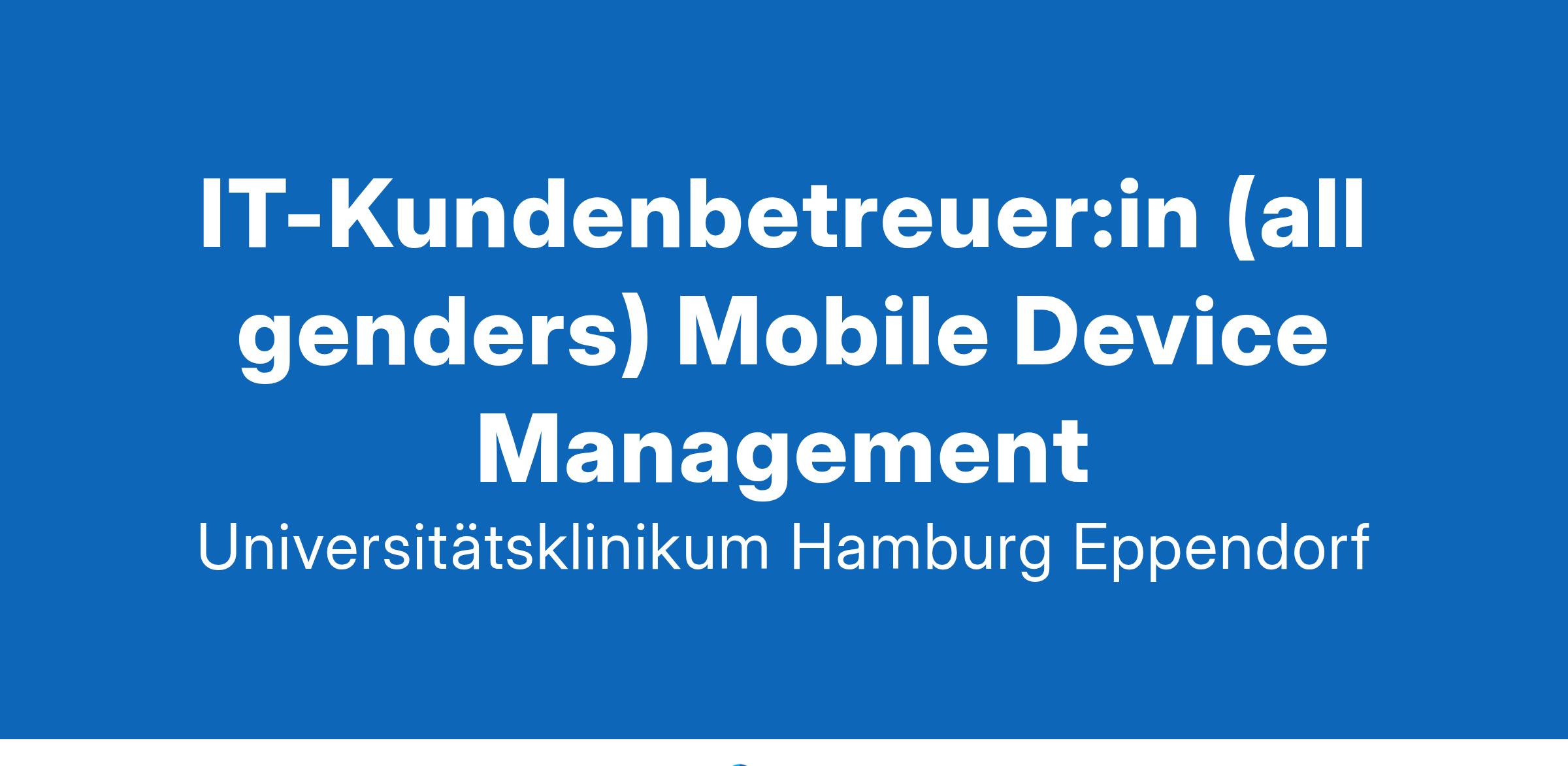 IT-Kundenbetreuer:in (all genders) Mobile Device ManagementVollzeit/Teilzeit | Unbefristet | Arbeitsort: Hamburg EppendorfUKE_Zentrale DiensteGemeinsam besser. Fürs Leben.Wir sind das Universitätsklinikum Hamburg-Eppendorf (UKE) - und stehen für exzellente Kompetenz in Forschung, Lehre und der vollumfänglichen Gesundheitsversorgung in unseren Kliniken. Unsere rund 15.300 Mitarbeiter:innen streben jeden Tag aufs Neue danach, mit ihrem Beitrag die Welt ein bisschen gesünder zu machen.