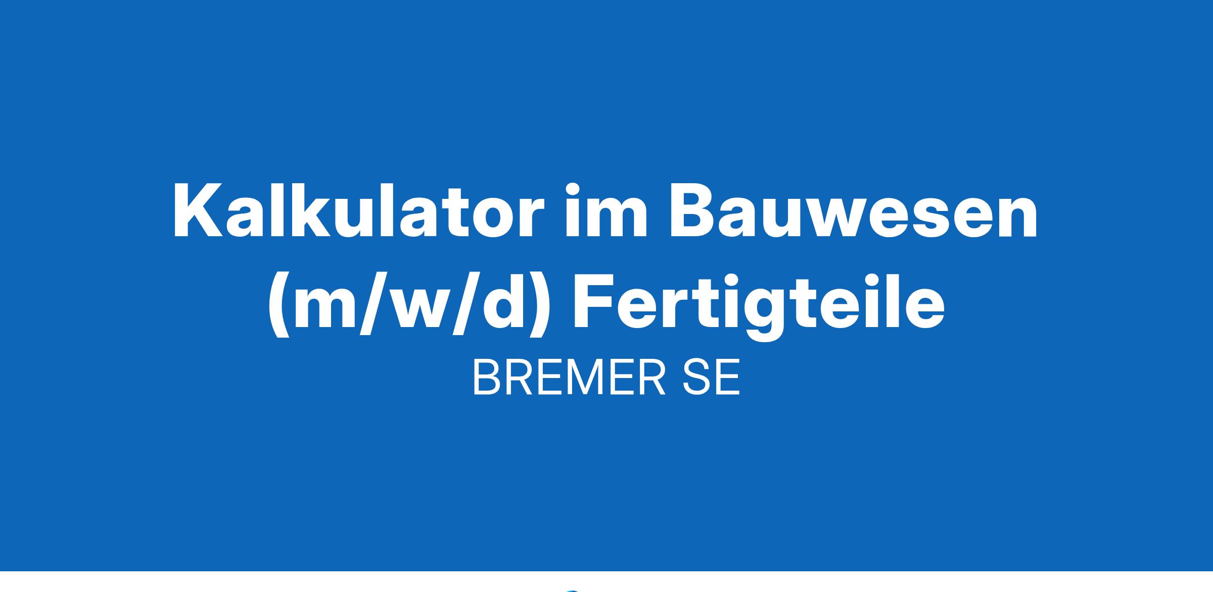 KALKULATOR IM BAUWESEN (m/w/d) FERTIGTEILEBerufserfahrungArchitektur, BauwesenWIR SIND:In Deutschland zählt BREMER zu den führenden Unternehmen im schlüsselfertigen Industrie- und Gewerbebau. Als ganzheitlicher Anbieter der Immobilien- und Bauwirtschaft begleiten wir unsere Kunden von der Projektentwicklung über die Fertigung in eigenen Werken bis zum schlüsselfertigen Bau und den Serviceleistungen für das Gebäude im laufenden Betrieb. Das 1947 gegründete Familienunternehmen agiert an fünfzehn deutschen und zwei polnischen Standorten und erwirtschaftet aktuell eine Betriebsleistung von gut 1.100 Mio. EUR. Rund 1300 Mitarbeitende setzen sich täglich mit Leidenschaft für den Kundenerfolg ein.