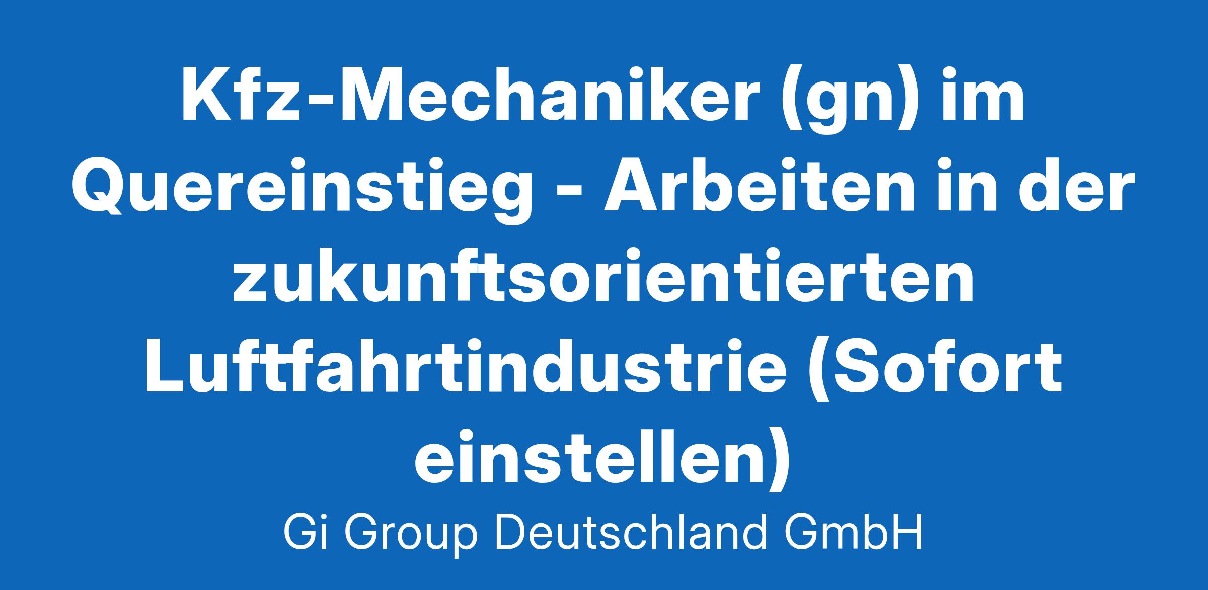 Kfz-Mechaniker (gn) im Quereinstieg ab sofort in Vollzeit in Hamburg im Rahmen der Direktvermittlung Die Gi Group ist ein international agierender Personaldienstleister mit mehr als 500 Standorten in 40 Ländern. Unser Kunde ist ein renomniertes und zukunftorientiertes Unternehmen aus der Luftfahrt. Deine Aufgaben Die Wartung und Reparatur von Flugzeugkomponenten Reparaturaufträge bearbeiten und Modifikationen im Rahmen der ergänzenden Instandhaltung durchführen Komponenten auf einem Teststand prüfen und einstellen Dokumentation der Instandhaltungsarbeiten vornehmen und Komponenten für den Flugbetrieb zertifizieren Dein Profil Eine abgeschlossene Berufsausbildung in einem luftfahrttechnischen Bereich, z.B. Fluggerätmechaniker Alternativ: Eine abgeschlossene Berufsausbildung in einem metallverarbeitenden Bereich, z.B.Industriemechaniker, Kfz-Mechaniker, Zerspanungsmechaniker, Mechatroniker, Werkzeugmechaniker, Feinwerkmechaniker, Anlagenmechaniker oder eine vergleichbare Qualifikation Bereitschaft zum Erwerb fehlender Qualifikationen sowie zu berufsbezogener Weiterbildung Gute Englischkenntnisse Das bietet unser Kunde Urlaubs- und Weihnachtsgeld sowie eine Gewinnbeteiligung Flexible Arbeitszeiten (Gleitzeit, keine Schichtarbeit) und 30 Tage Urlaub Flugvergünstigungen, Einkaufsrabatte in Geschäften und Jobrad-Leasing Kostenloses Parken, betriebliche Altersvorsorge und Verpflegungszuschuss für die Kantine Deine Bewerbung Für Deine Bewerbung als Kfz-Mechaniker im Quereinstieg klicke bitte einfach auf „Jetzt bewerben“. Dort kannst Du Deine Kontaktdaten eingeben sowie Deinen Lebenslauf und Deine Bewerbungsunterlagen hochladen. Du benötigst dafür nur ca. 1 Minute. Dein zuständiger Personaldisponent wird sich bei Dir schnellstmöglich melden. Gerne kannst Du uns auch Deine Bewerbungsunterlagen per E-Mail zusenden. Wir freuen uns auf Deine Bewerbung als Kfz-Mechaniker im Quereinstieg! Unsere Stellenangebote richten sich an Arbeitssuchende jeglichen Geschlechts. (gn) = geschlechtsneutral. Kontakt Gi Group Recruiting Team